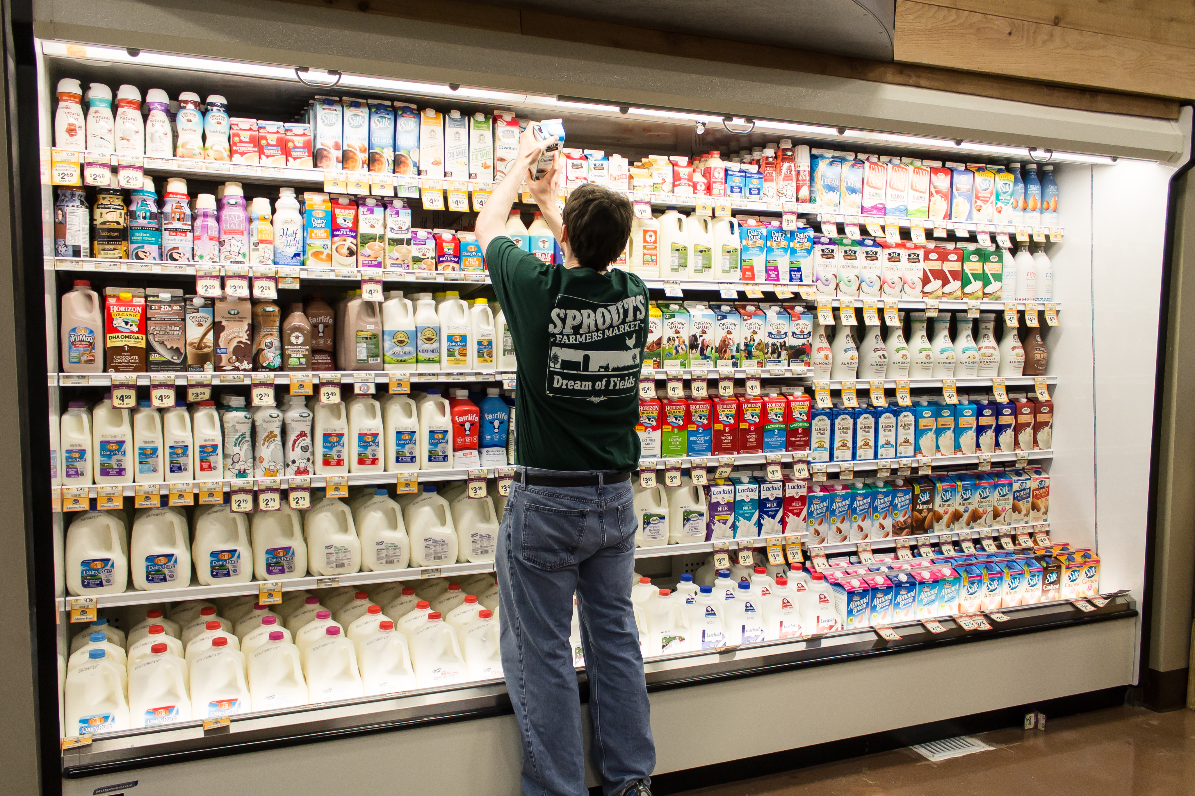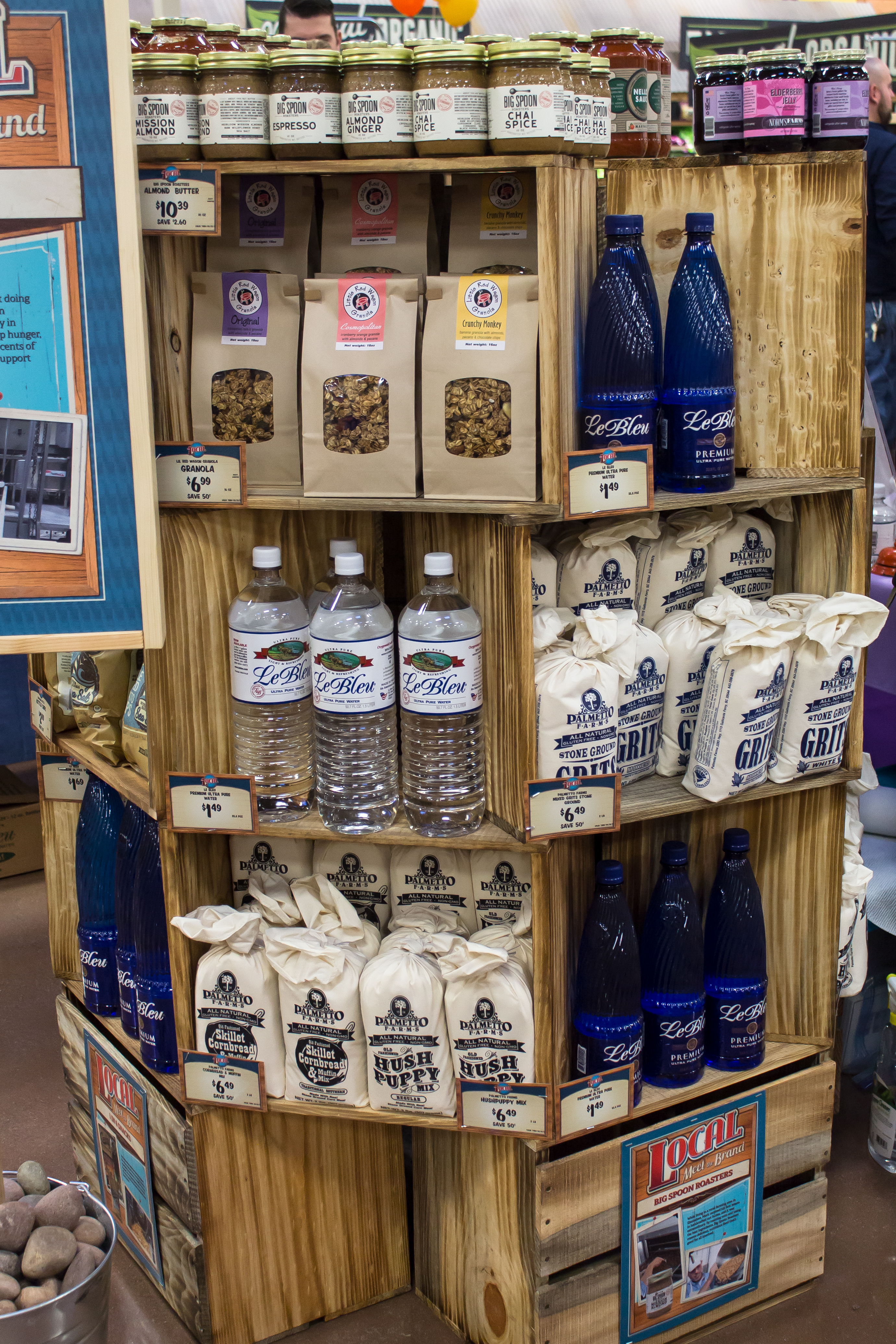 Each Sprouts Farmers Market store carries local items. In this case, local is defined as goods that are produced in North Carolina or within 500 miles. This entire shelf of food is filled with local items, but all of the local items around the store have blue tags to make them easily identifiable as well.