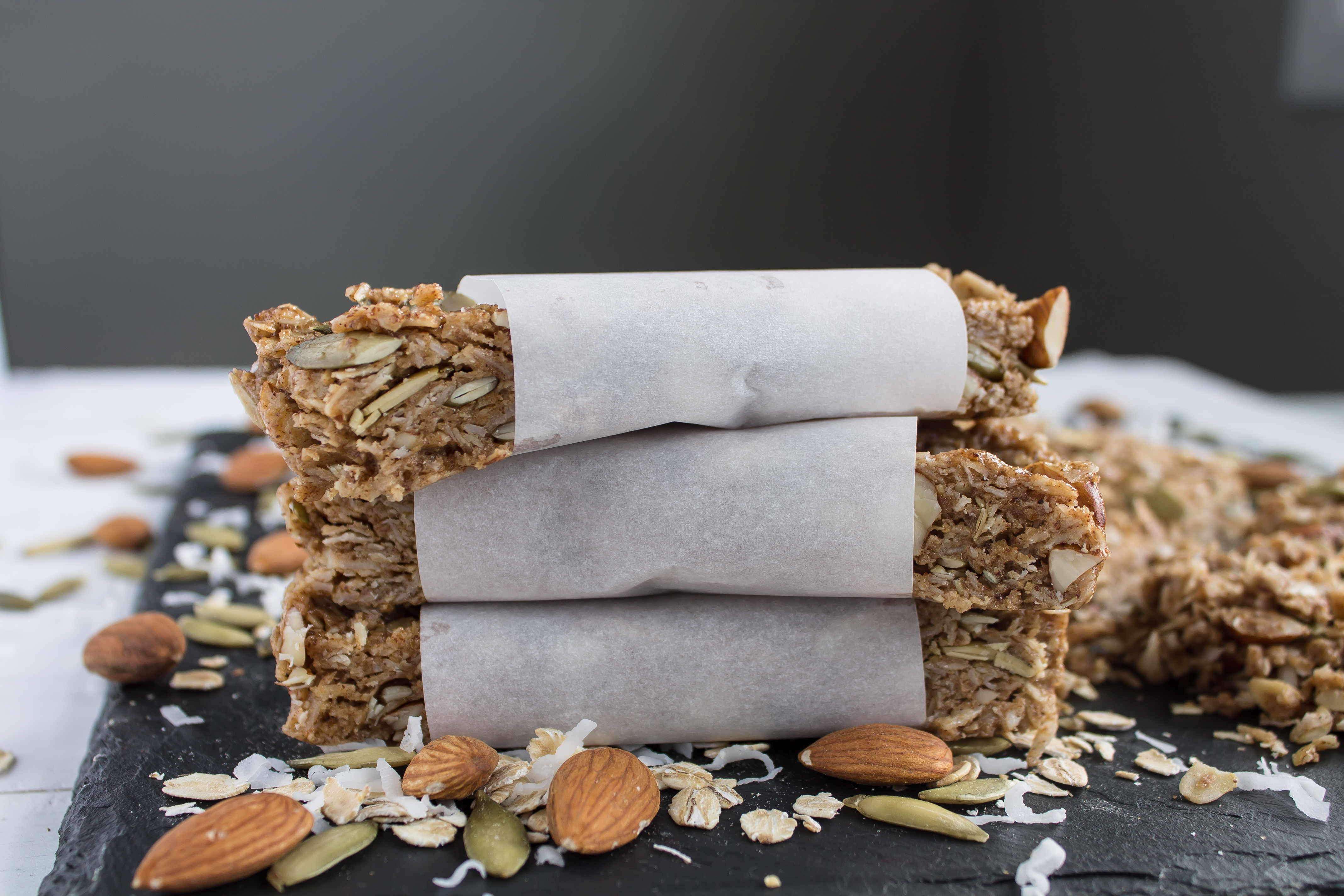 These bars are filled with nuts, seeds and grains, with a little extra sweetness from honey. Almond butter and honey (or maple syrup, for vegans), bind the other ingredients together and keep the bars from crumbling to pieces. Chopped almonds, pepitas, shredded coconut and oats are suspended in the mixture, delivering a different texture to every bite. Another bonus: these bars are so so so easy. Mix the ingredients, refrigerate, cut and eat – that’s it!