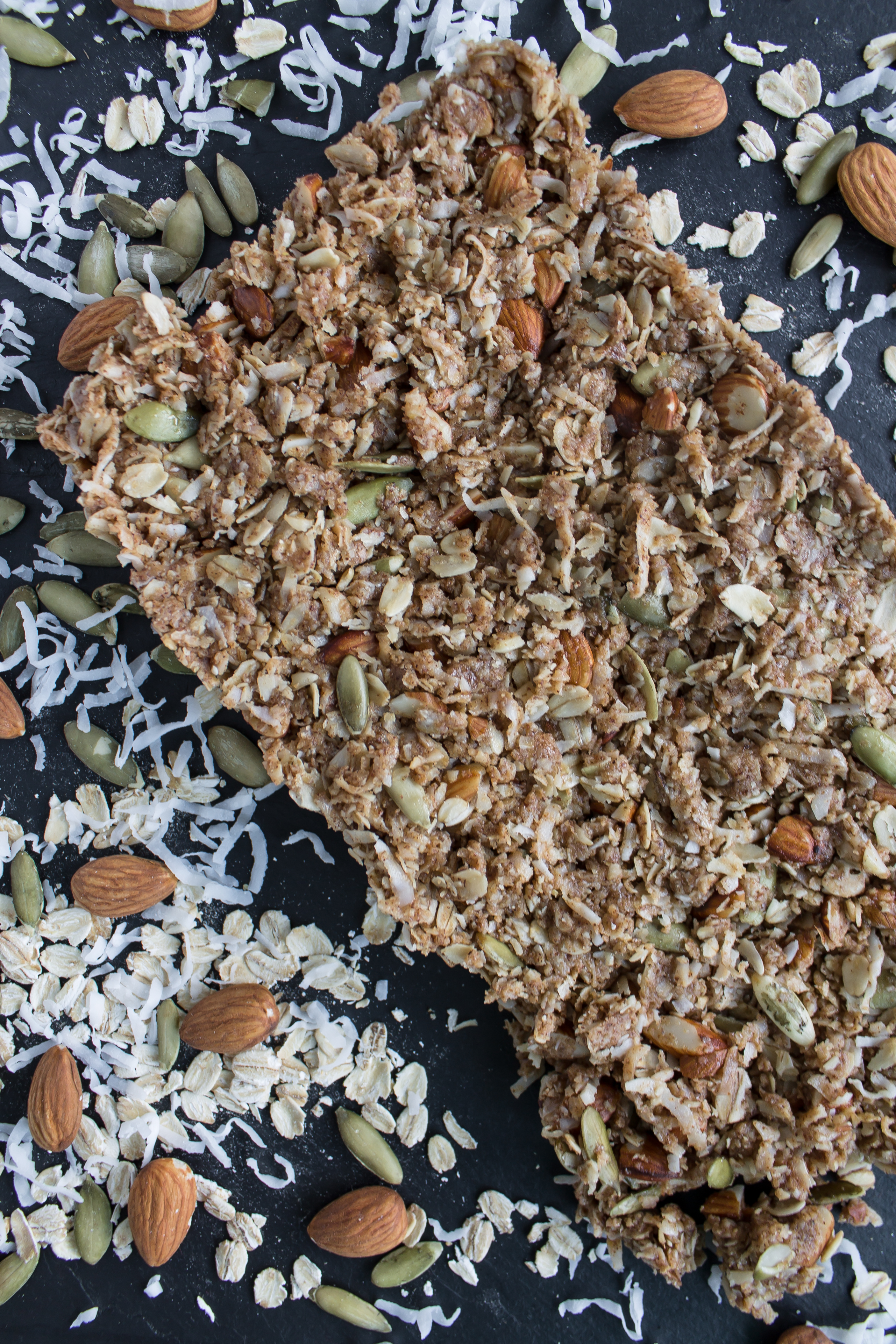 I wanted these to be purely nutty goodness, without the usual dried fruit mix-ins that I would add to regular granola, but you can definitely add chopped dried fruit as long as you decrease the amount of other mix-ins (chopped almonds, pepitas, shredded coconut). You can switch up the almond butter for peanut butter, swap toasted almonds for toasted pecans, increase the sweetness with more honey; it’s up to you! Use these proportions, but make them your own!