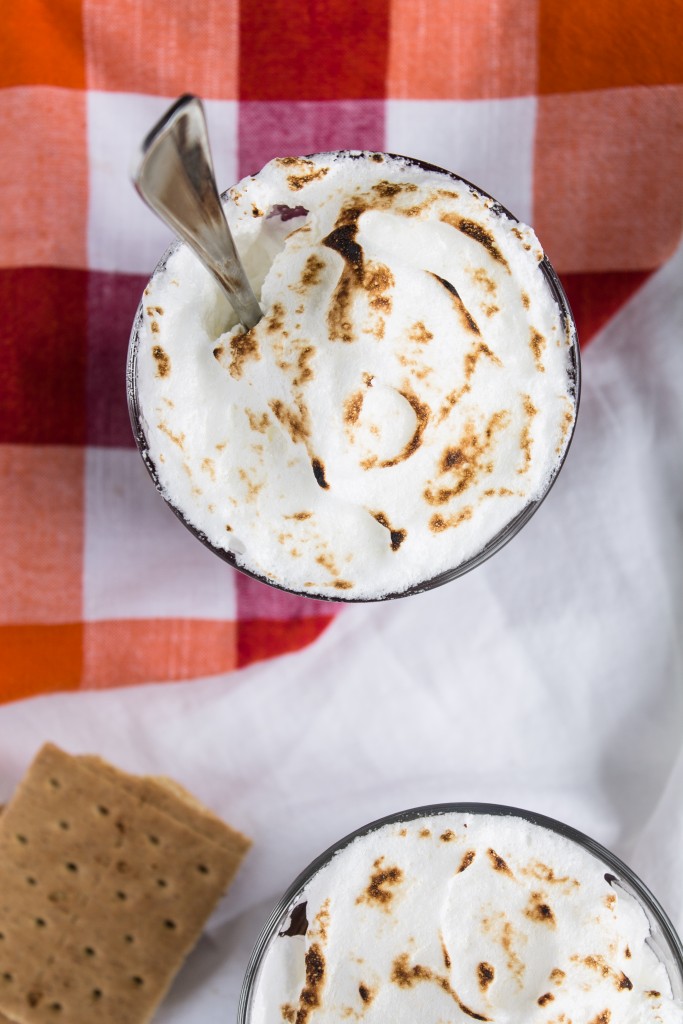 We use bittersweet chocolate to make the custard deep and dark, and espresso powder to bring out the chocolate flavor. It is rich rich rich, but amazing. When I was testing this (all in the name of research and pictures, of course) I kept telling myself I would just take one more bite. One more bite, one more bite. I was halfway through the glass in a matter of seconds. Each bite of the chocolate filling made me want another. The graham cracker streusel and the meringue balance out the dark chocolate custard, and the layers meld together in your mouth to form that familiar, but elevated, s’mores flavor.