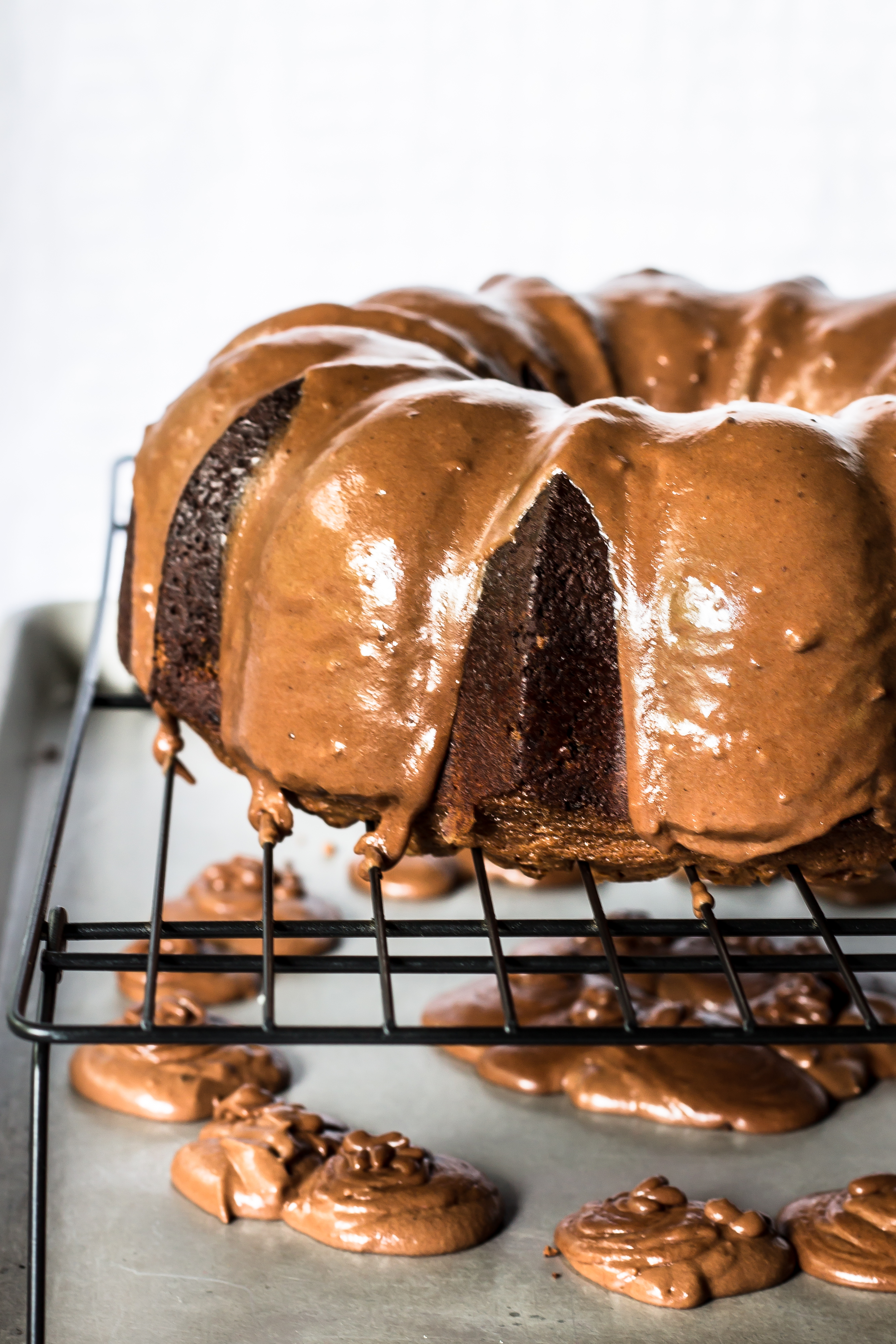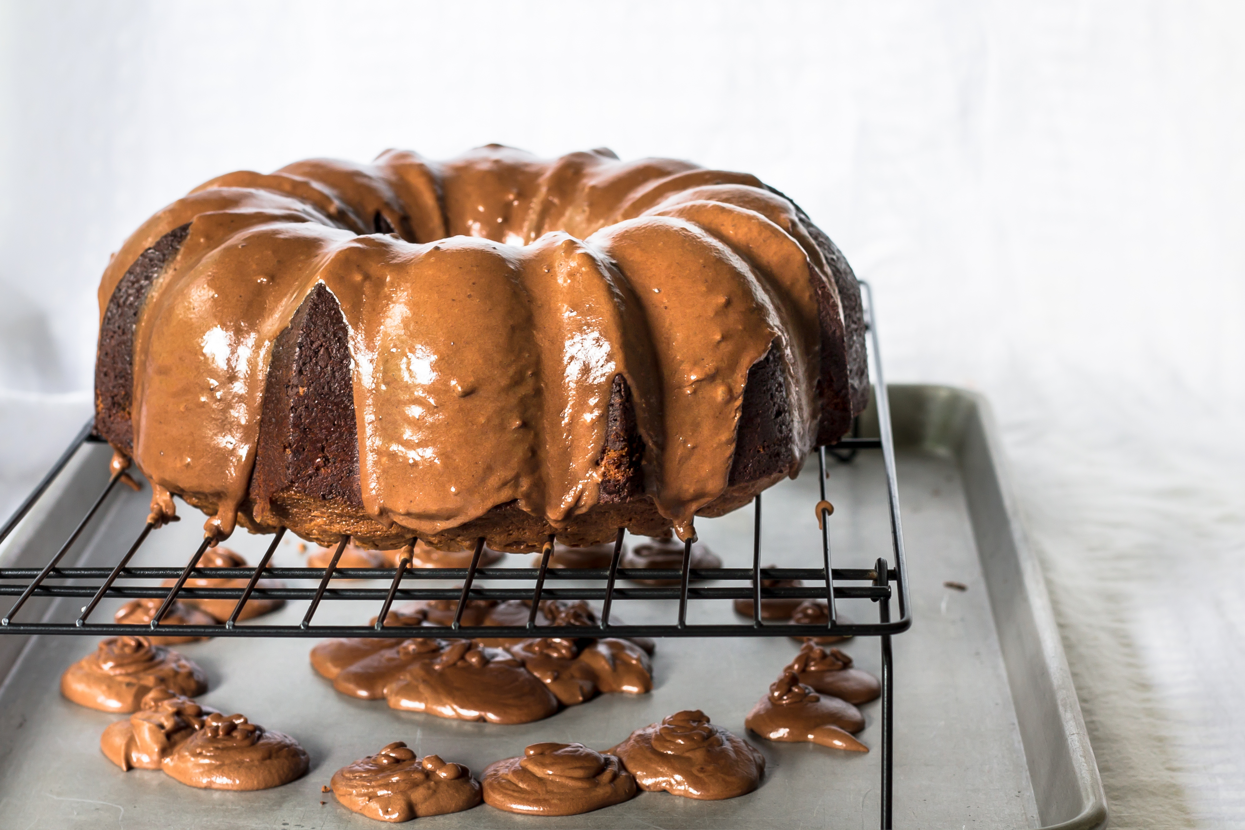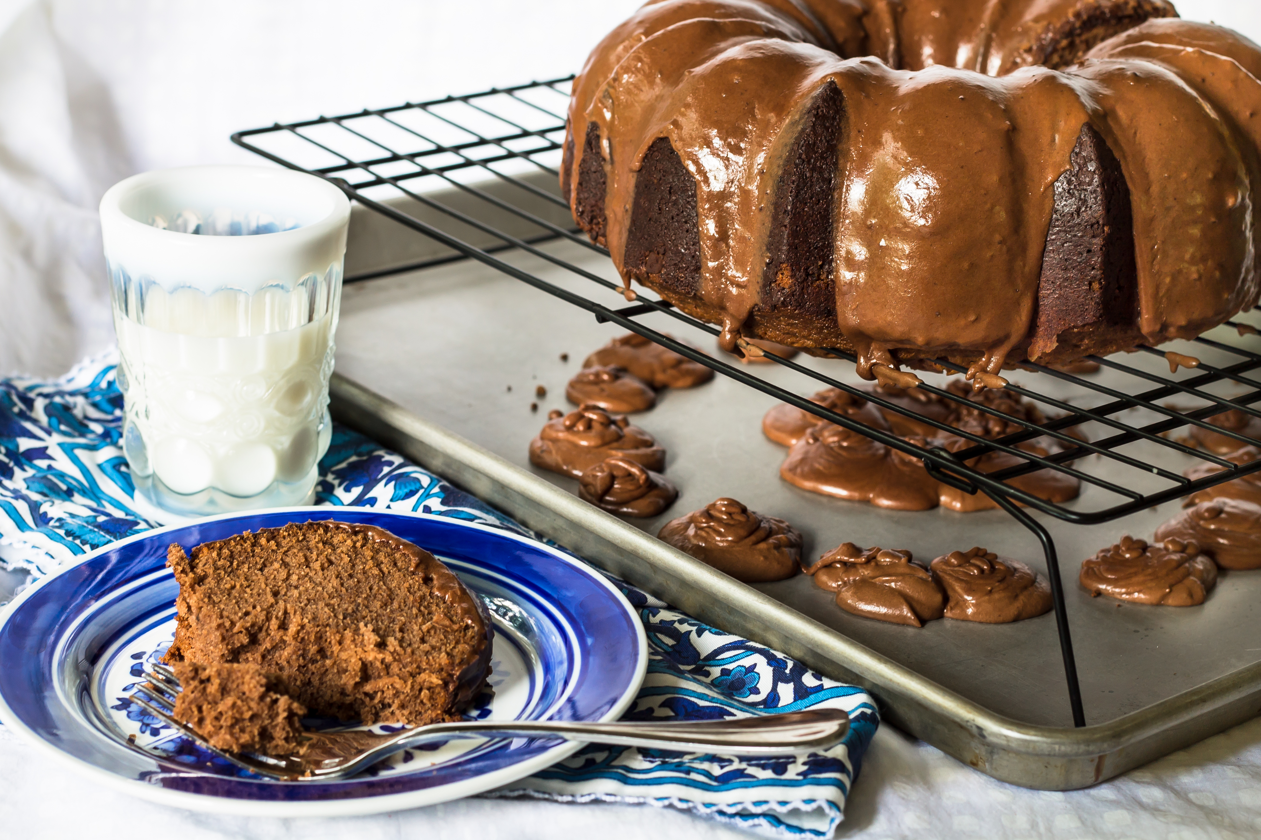 Spoon the chocolate glaze over the warm cake, letting it drizzle down the sides. This cake is great served warm, cool, or chilled.