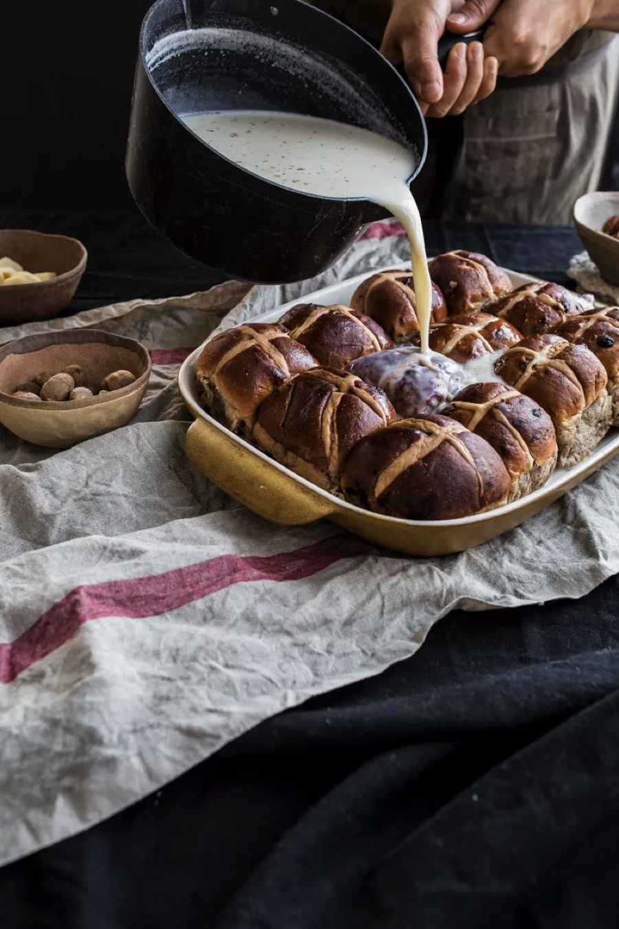 This hot cross bun bake is great for large groups. Better and more appropriate than a french toast bake, but still feeds a crowd when cut up in slices and buns. Fluffy spiced bread soaked in nutmeg sauce look and sound like an incredibly delicious way to start the day.