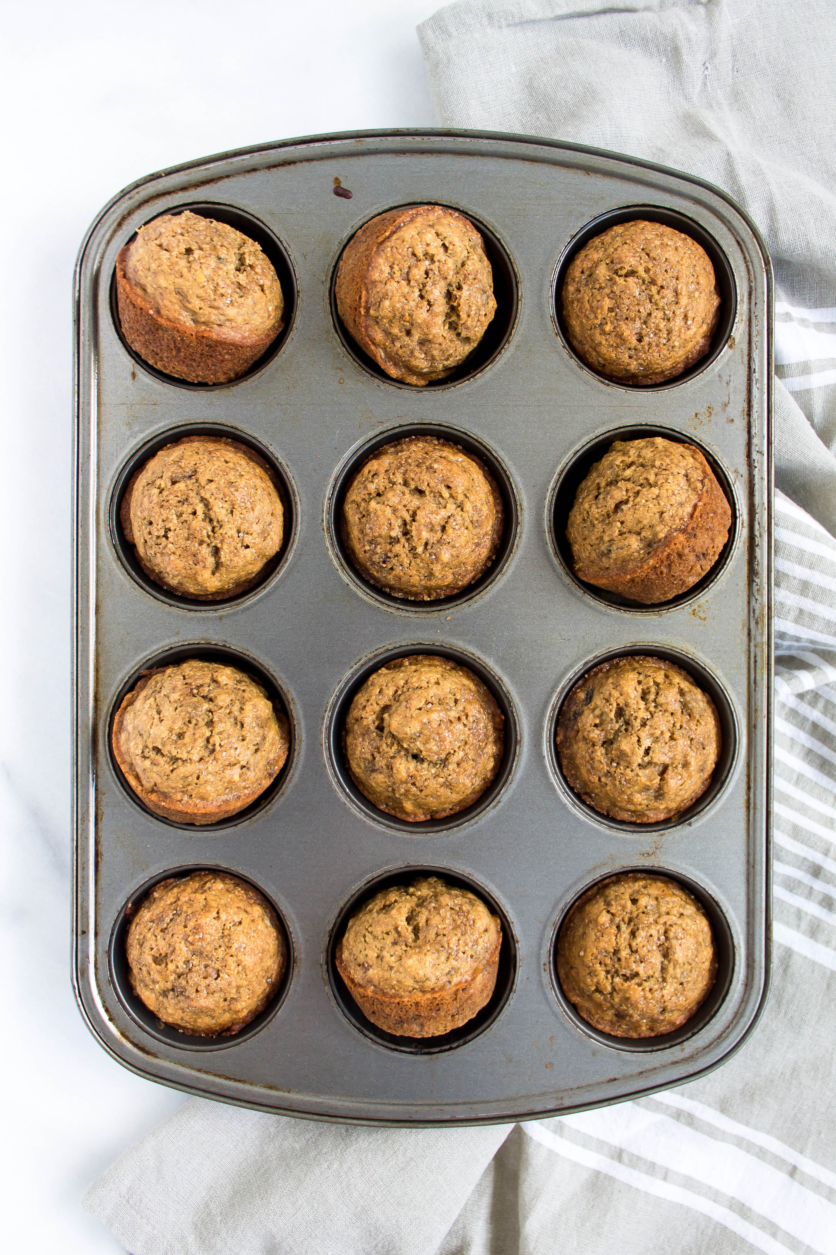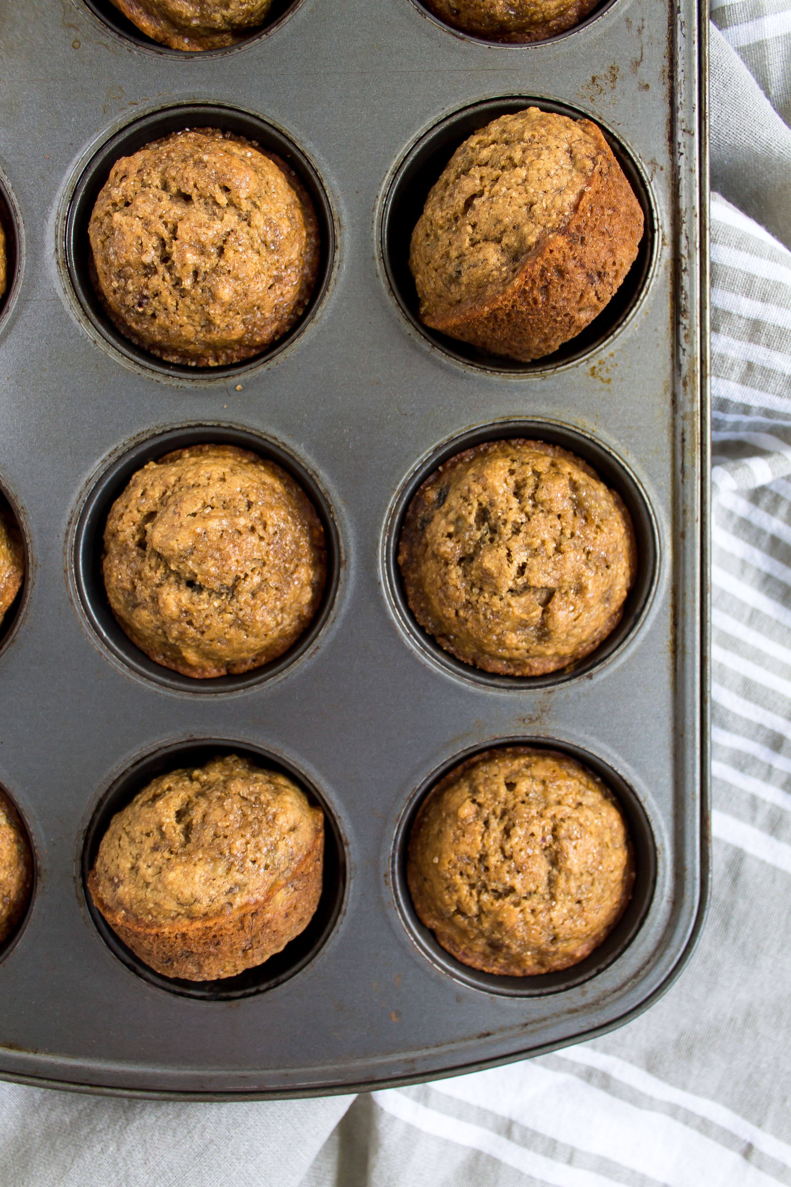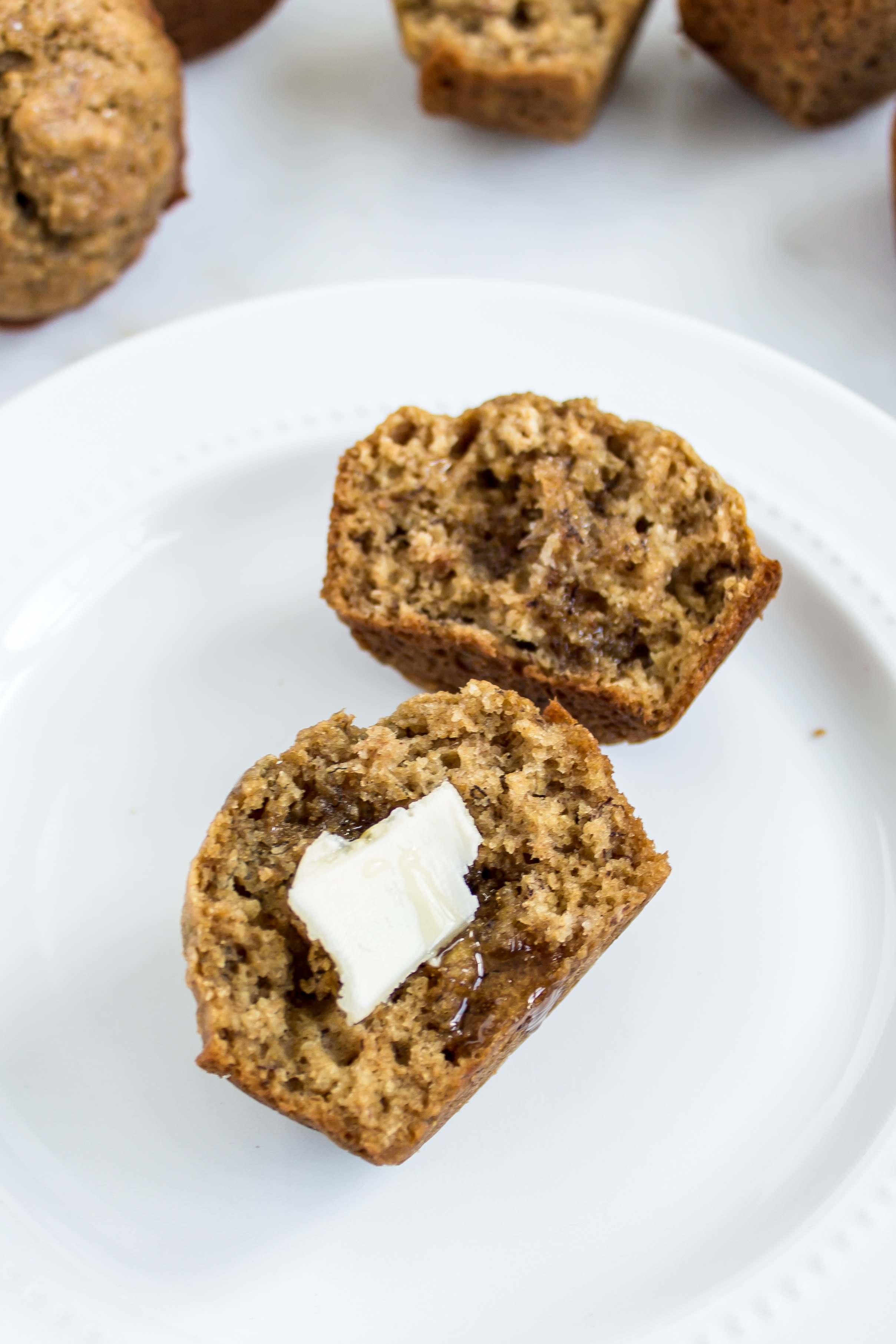 With only two of us around, it can be tricky (and tempting) to have a whole loaf of banana bread sitting on the counter. Since our schedules are both hectic right now with the start of the school year and new clinical rotation schedules, I wanted a more pre-portioned, on-the-go option that I wouldn’t feel bad about snagging on my way out the door in the morning. Healthy banana muffins were a wonderful solution. These muffins taste so similar to regular banana bread that you wouldn’t even know they were healthier from the taste, which is always the goal in my book :)