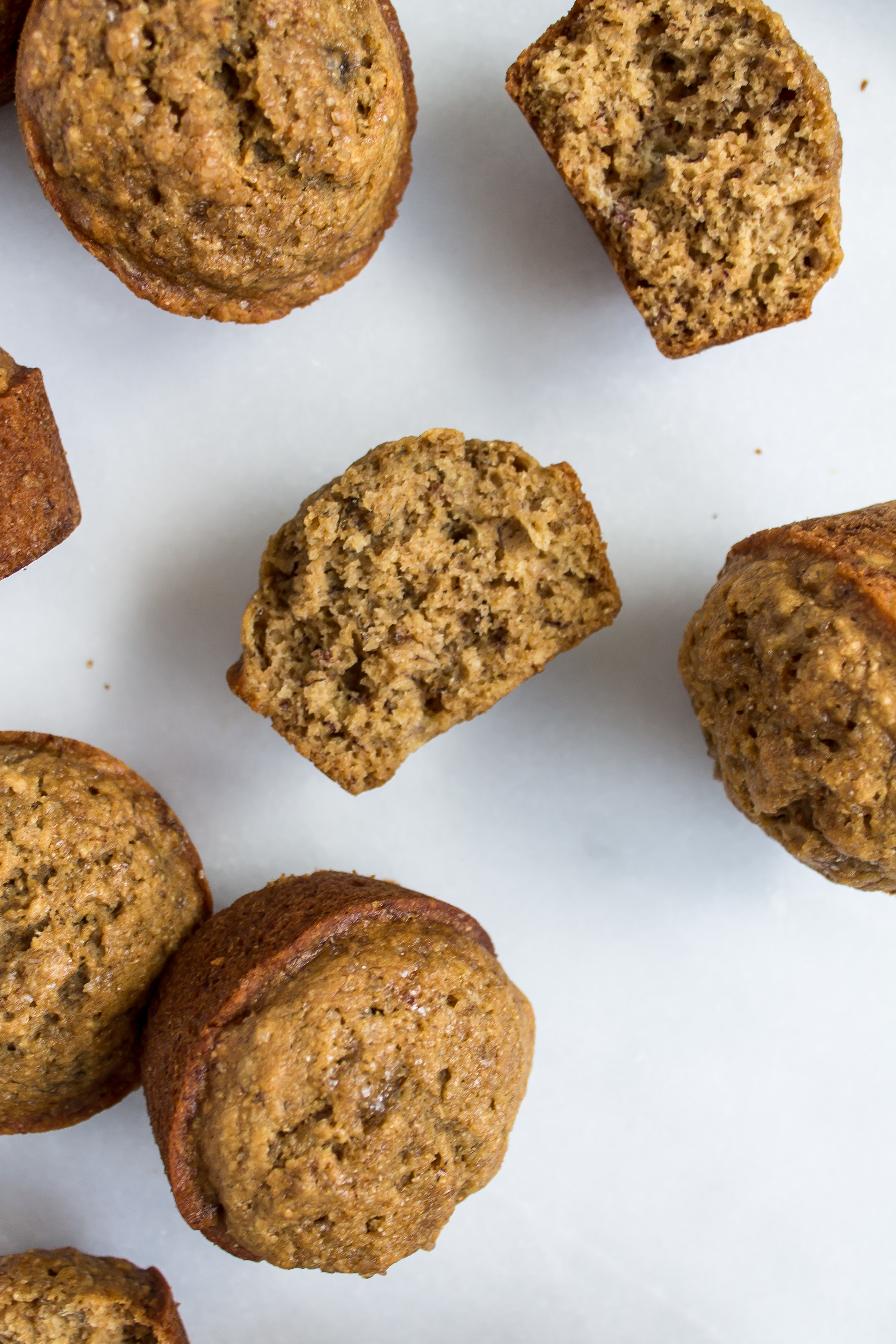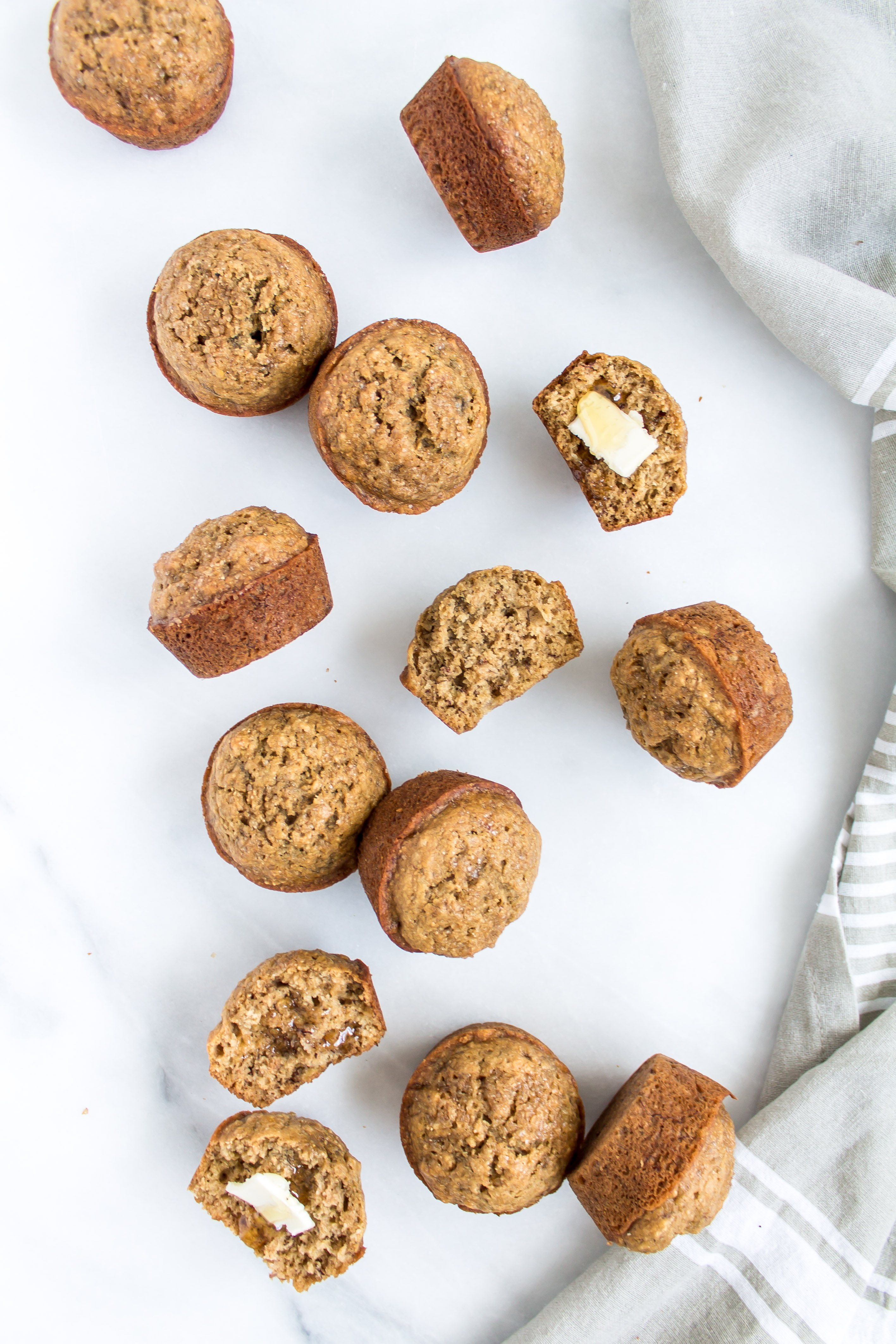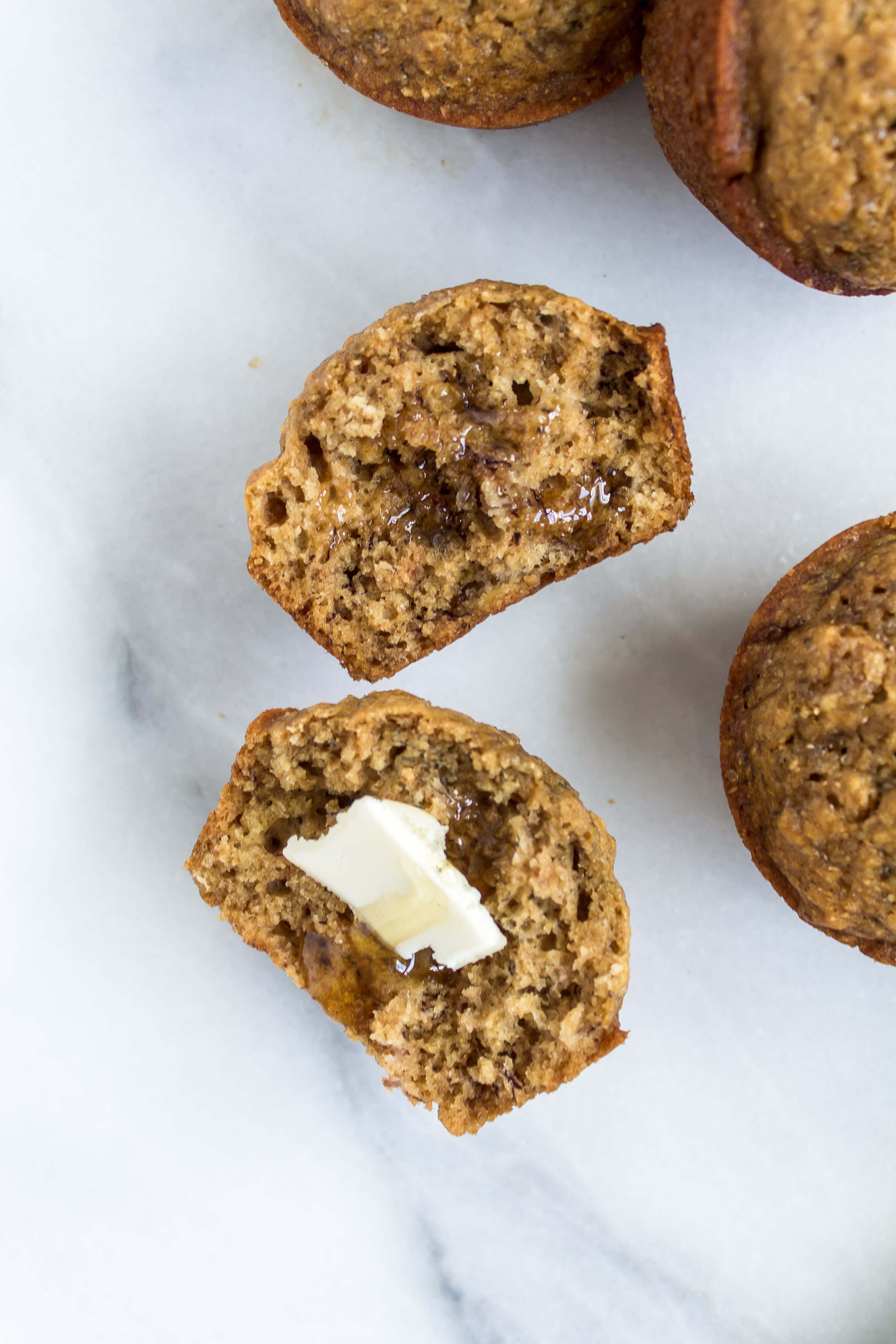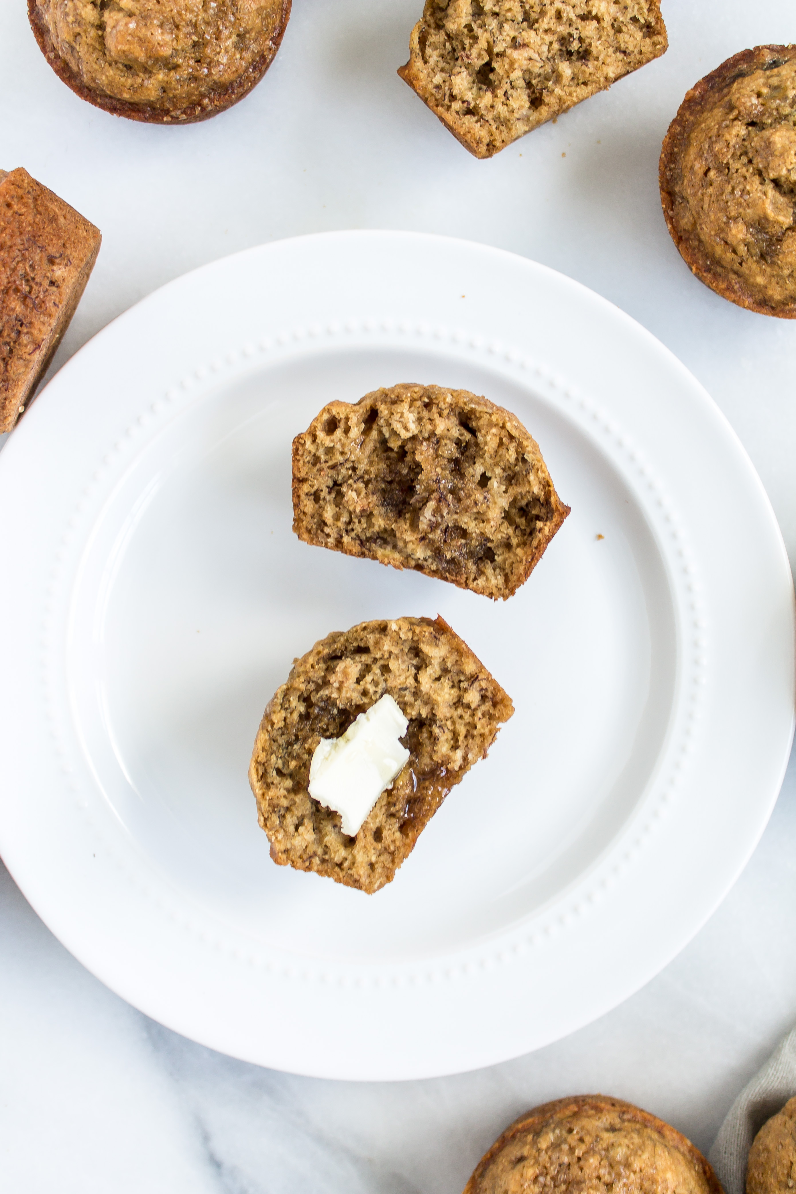 With only two of us around, it can be tricky (and tempting) to have a whole loaf of banana bread sitting on the counter. Since our schedules are both hectic right now with the start of the school year and new clinical rotation schedules, I wanted a more pre-portioned, on-the-go option that I wouldn’t feel bad about snagging on my way out the door in the morning. Healthy banana muffins were a wonderful solution. These muffins taste so similar to regular banana bread that you wouldn’t even know they were healthier from the taste, which is always the goal in my book :)