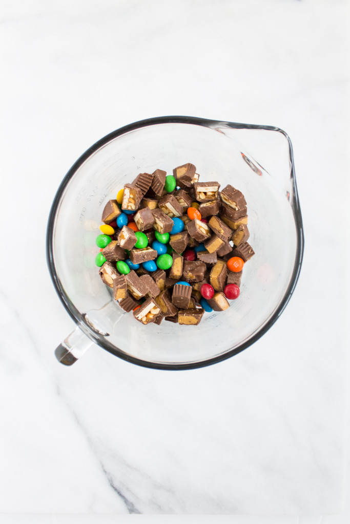 Chocolate and peanut butter is a classic, and always delicious, combination, but looking back at the recipe archives I’m surprised that I haven’t included many peanut butter-chocolate recipes here. I loaded these bars with peanut butter M&Ms, Reese’s cups, and Snicker’s bars, but you can make them your own and add whatever leftover candy you have! Though I stuck with the peanut butter-based chocolates, basically any leftover chocolate candy would work well.