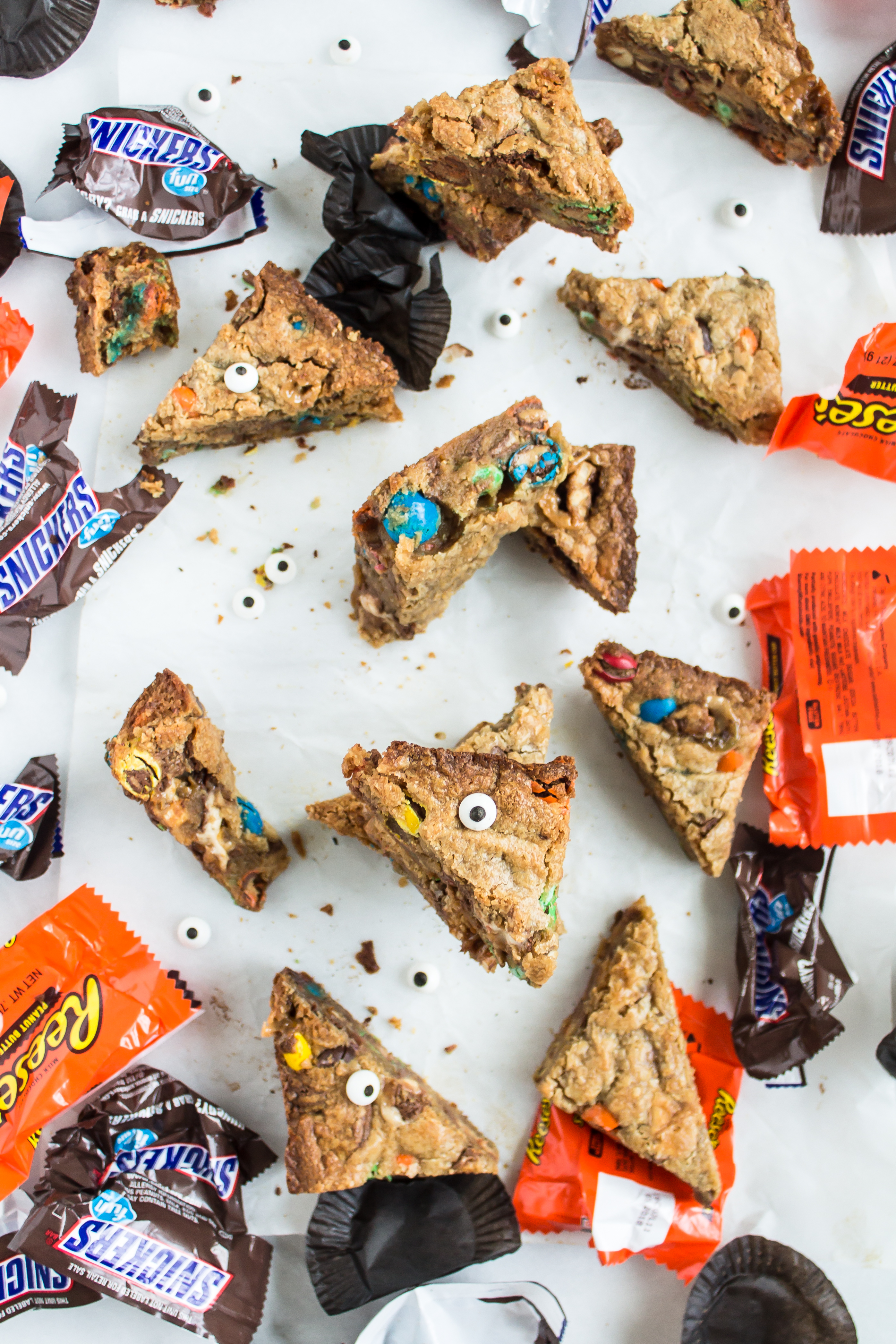 One of my favorite things to do around Halloween is to figure out a way to incorporate leftover candy in a baked good. I worry that I’ll run out of ideas for such a specific task, but so far, I love every variation. Last year I made M&M Reese’s sea salt chocolate chip cookies, the year before that we had brown butter blondie dark chocolate brownie candy swirled bars, and this year I’m excited to share these loaded peanut butter cookie bars.