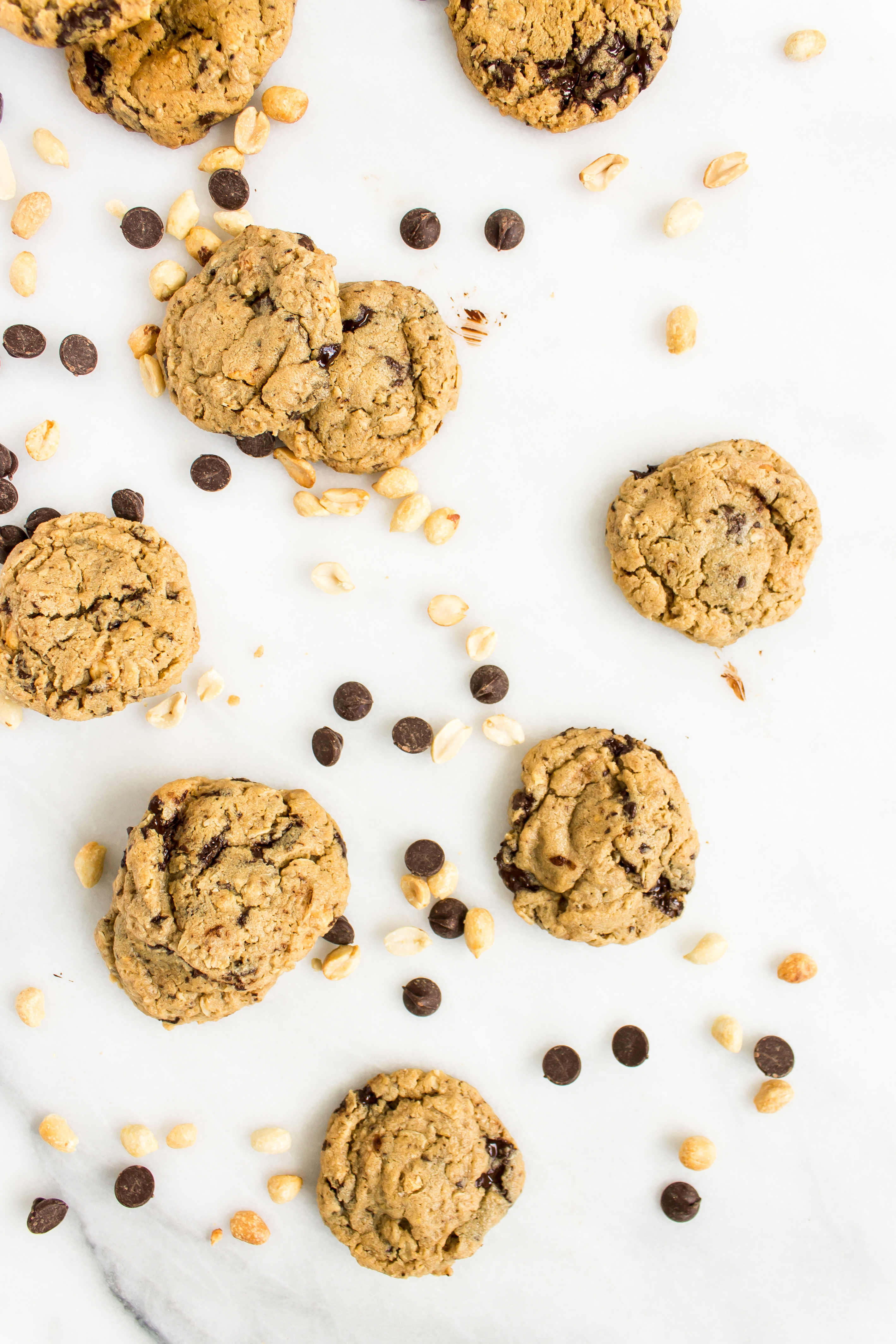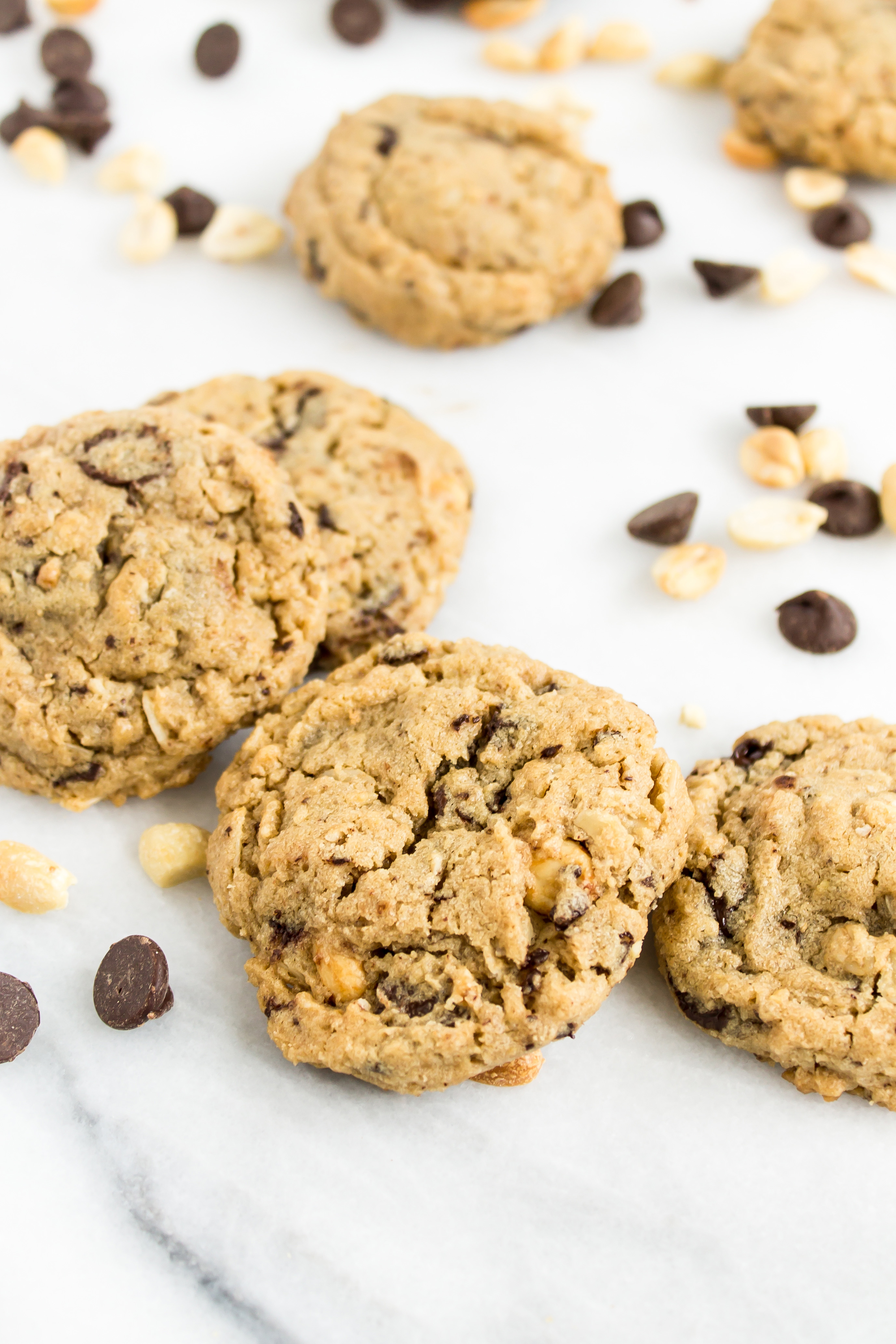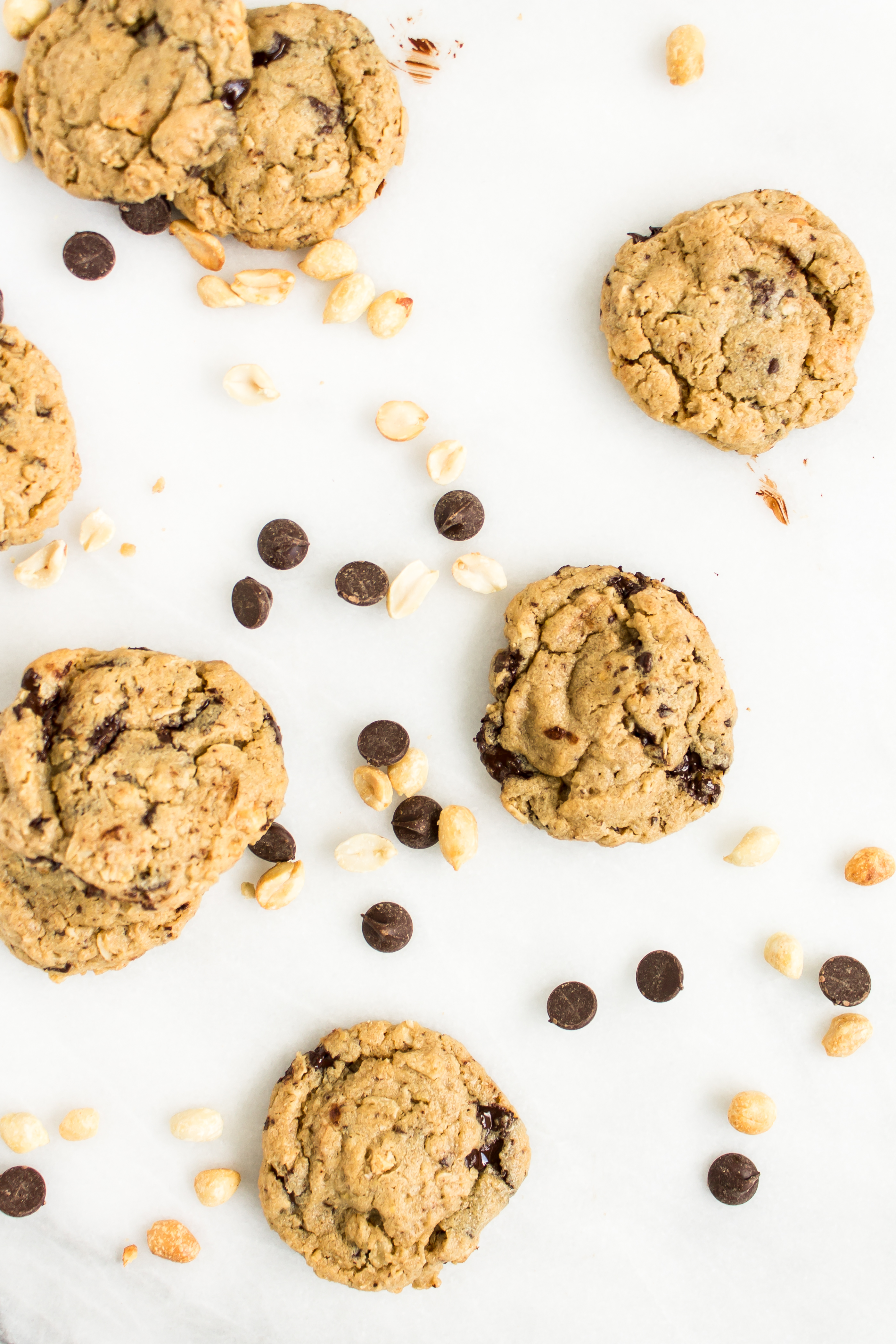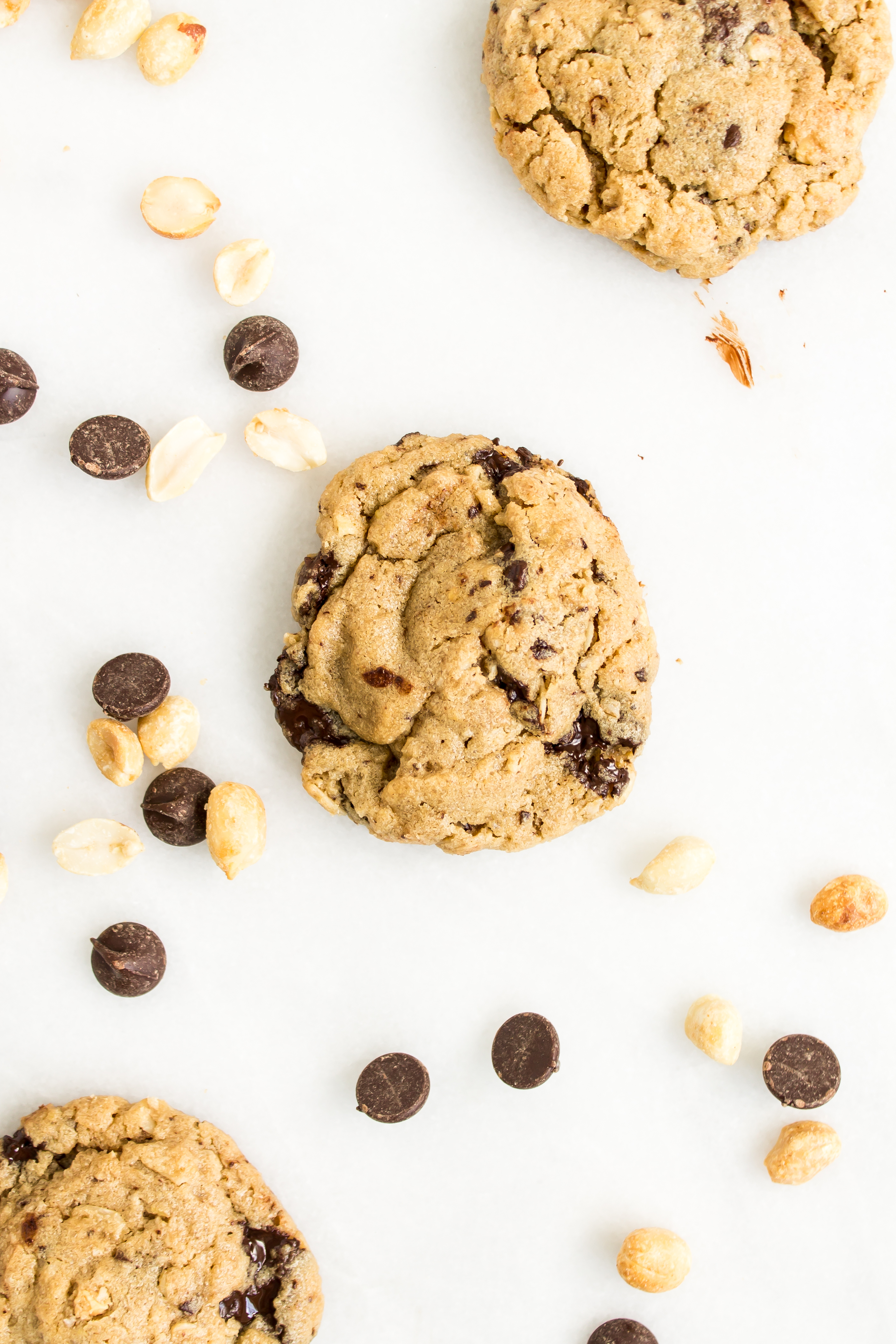 There is a café nearby that flaunts the most wonderful bakery counter. Behind the glass are jars of cookies, freshly baked quick breads, biscuits, scones, and muffins of the day. While I love snacking on the seasonal quick breads, the gingersnap cookies, and the fluffy chive biscuits, recently I have been drawn to the chunky peanut butter oatmeal chocolate chip peanut cookie. After trying the delicious peanut buttery treat after lunch one day, I came home with the craving for more, so I decided to see if I could recreate the goodness. It may be because these are warm, melty, and fresh out of my own oven, but I think they are even better than the original inspiration. Loaded peanut butter cookies have quickly become one of my favorite cookies of all time.