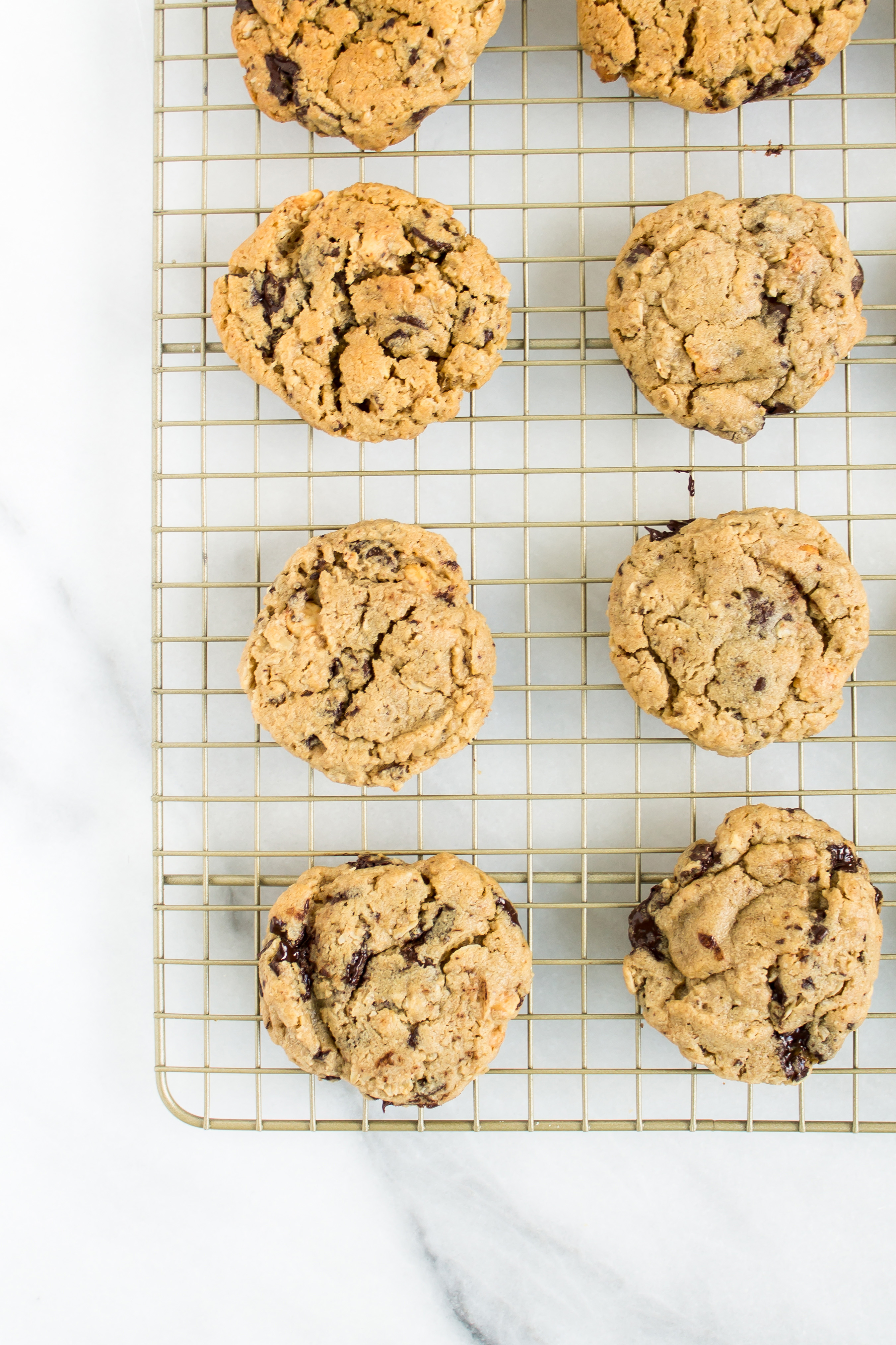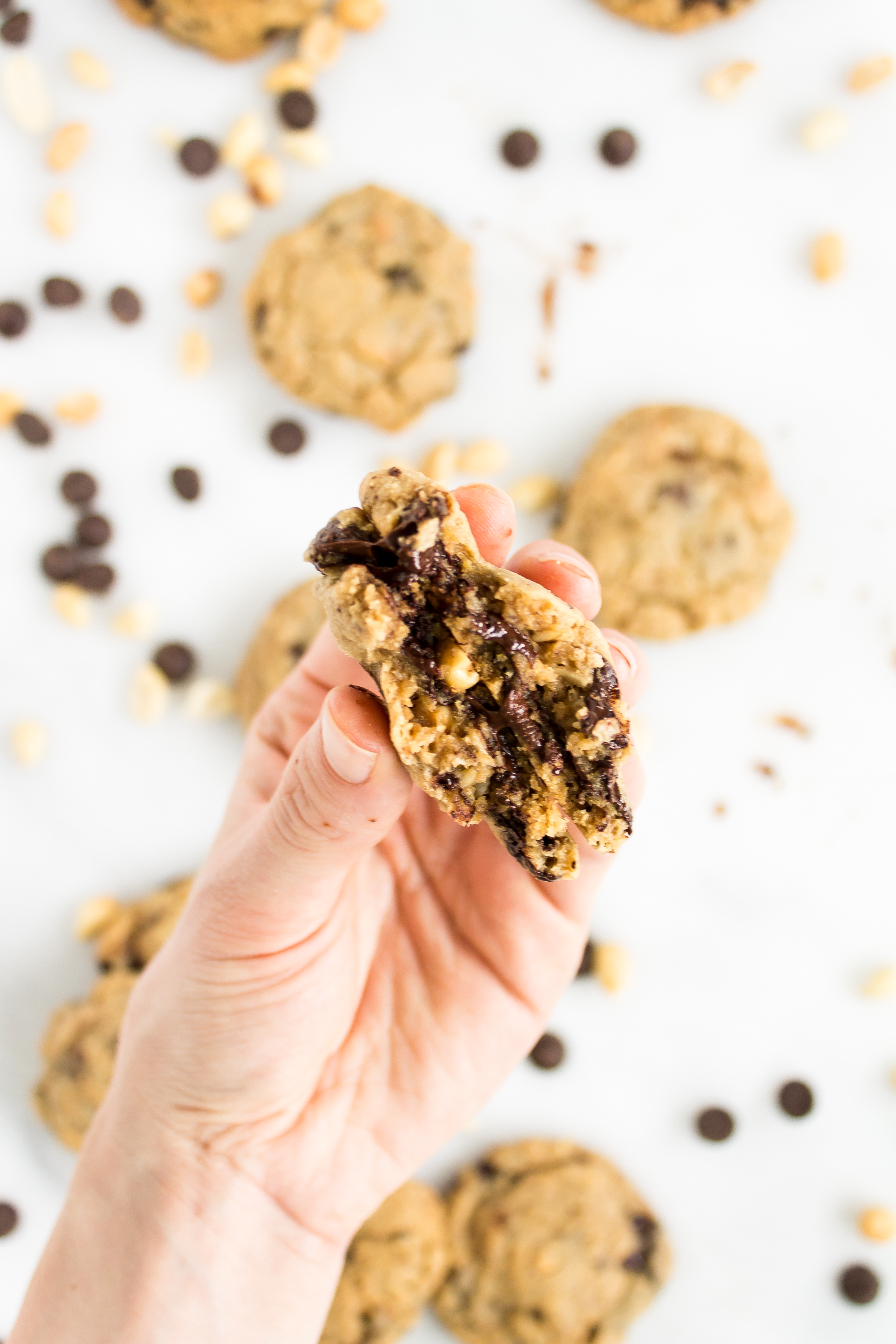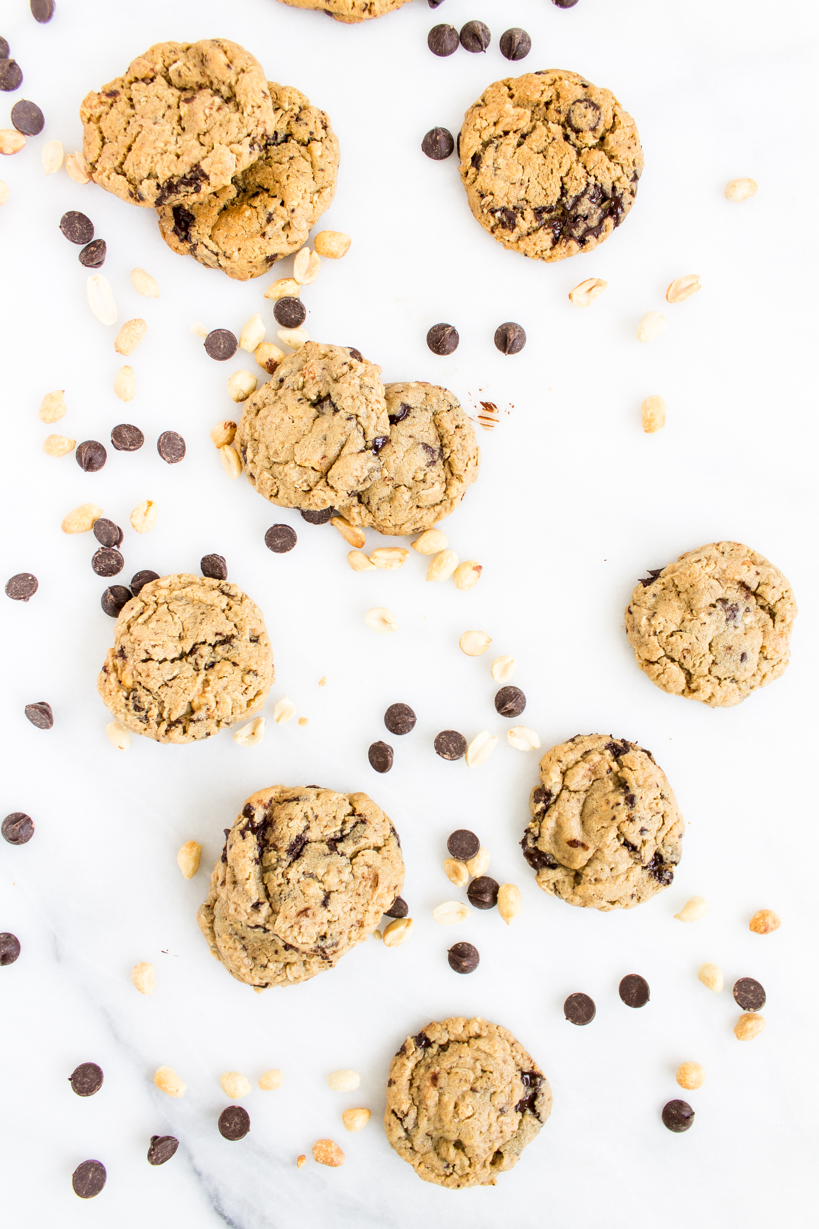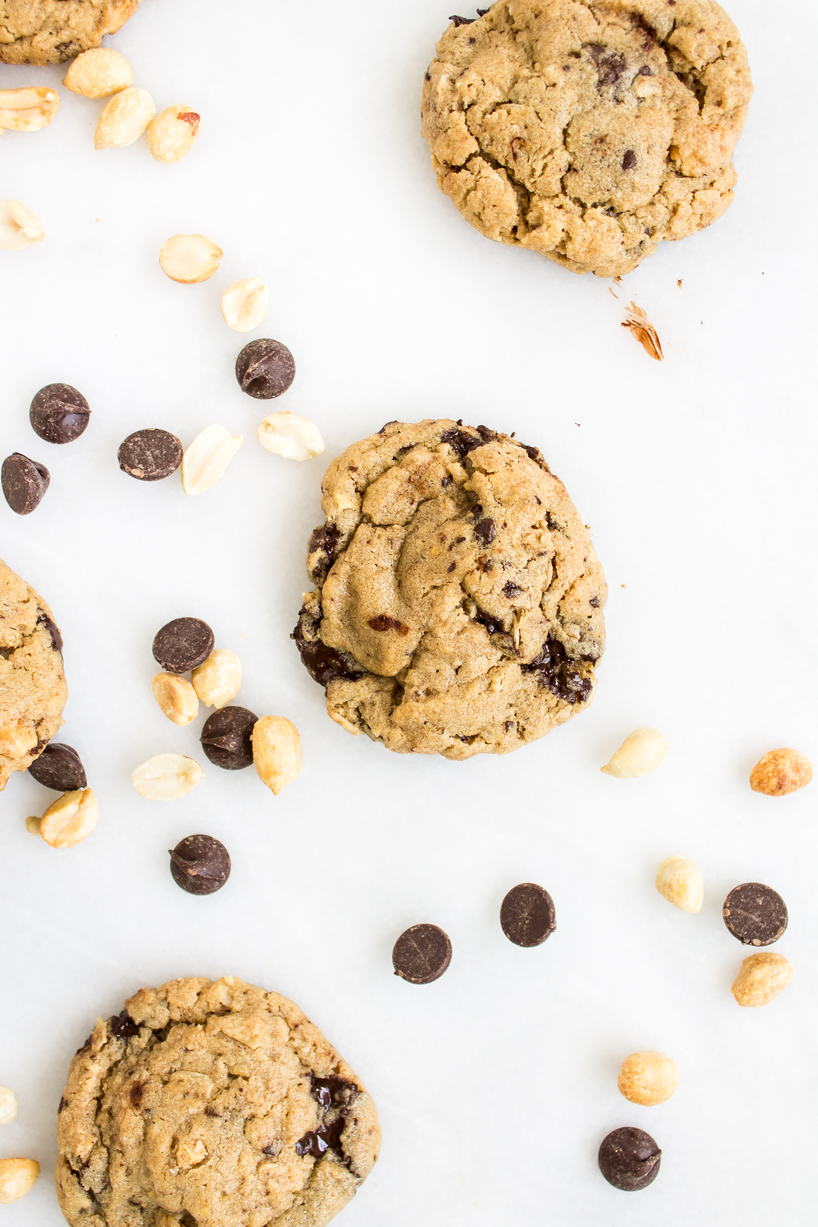 There is a café nearby that flaunts the most wonderful bakery counter. Behind the glass are jars of cookies, freshly baked quick breads, biscuits, scones, and muffins of the day. While I love snacking on the seasonal quick breads, the gingersnap cookies, and the fluffy chive biscuits, recently I have been drawn to the chunky peanut butter oatmeal chocolate chip peanut cookie. After trying the delicious peanut buttery treat after lunch one day, I came home with the craving for more, so I decided to see if I could recreate the goodness. It may be because these are warm, melty, and fresh out of my own oven, but I think they are even better than the original inspiration. Loaded peanut butter cookies have quickly become one of my favorite cookies of all time.
