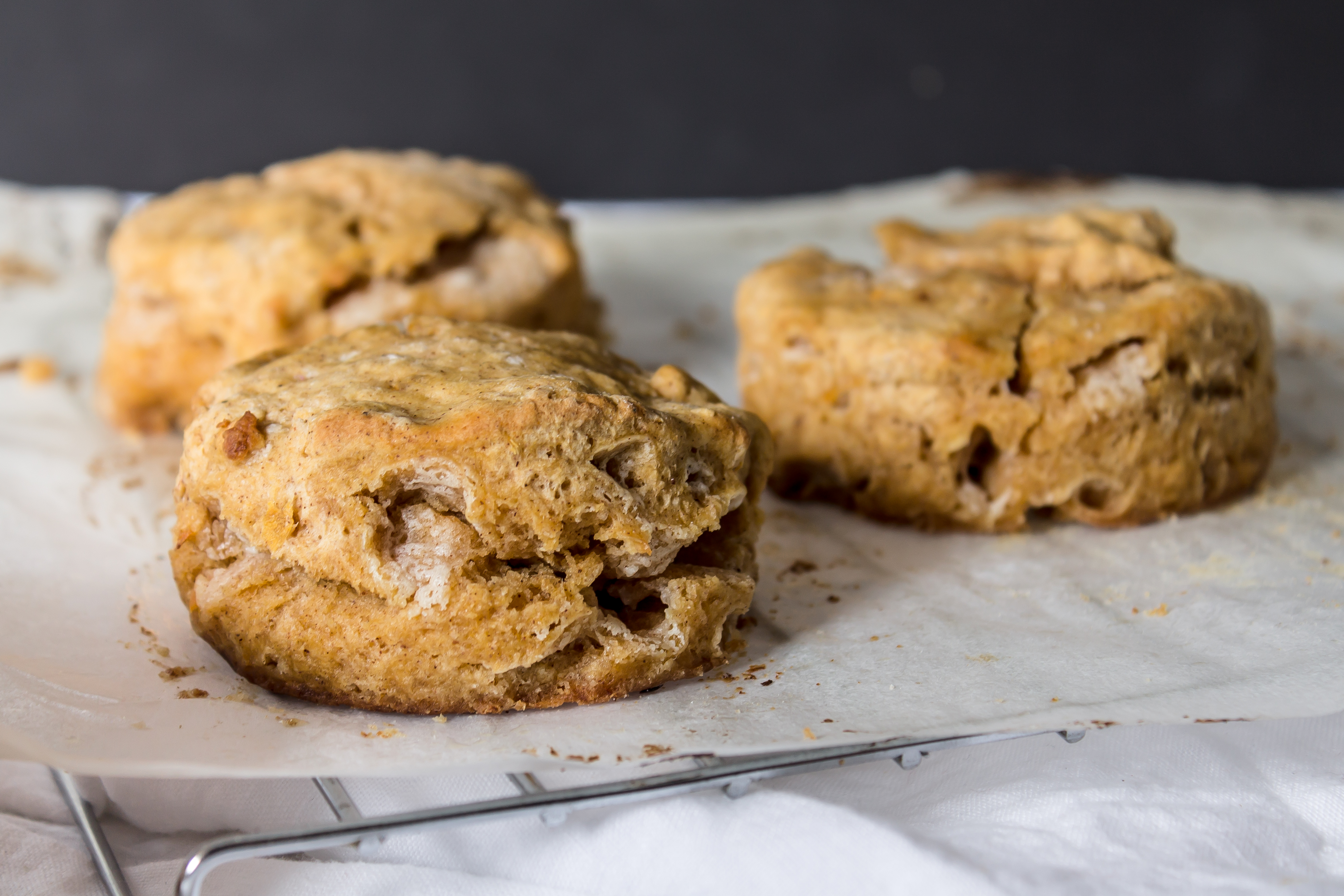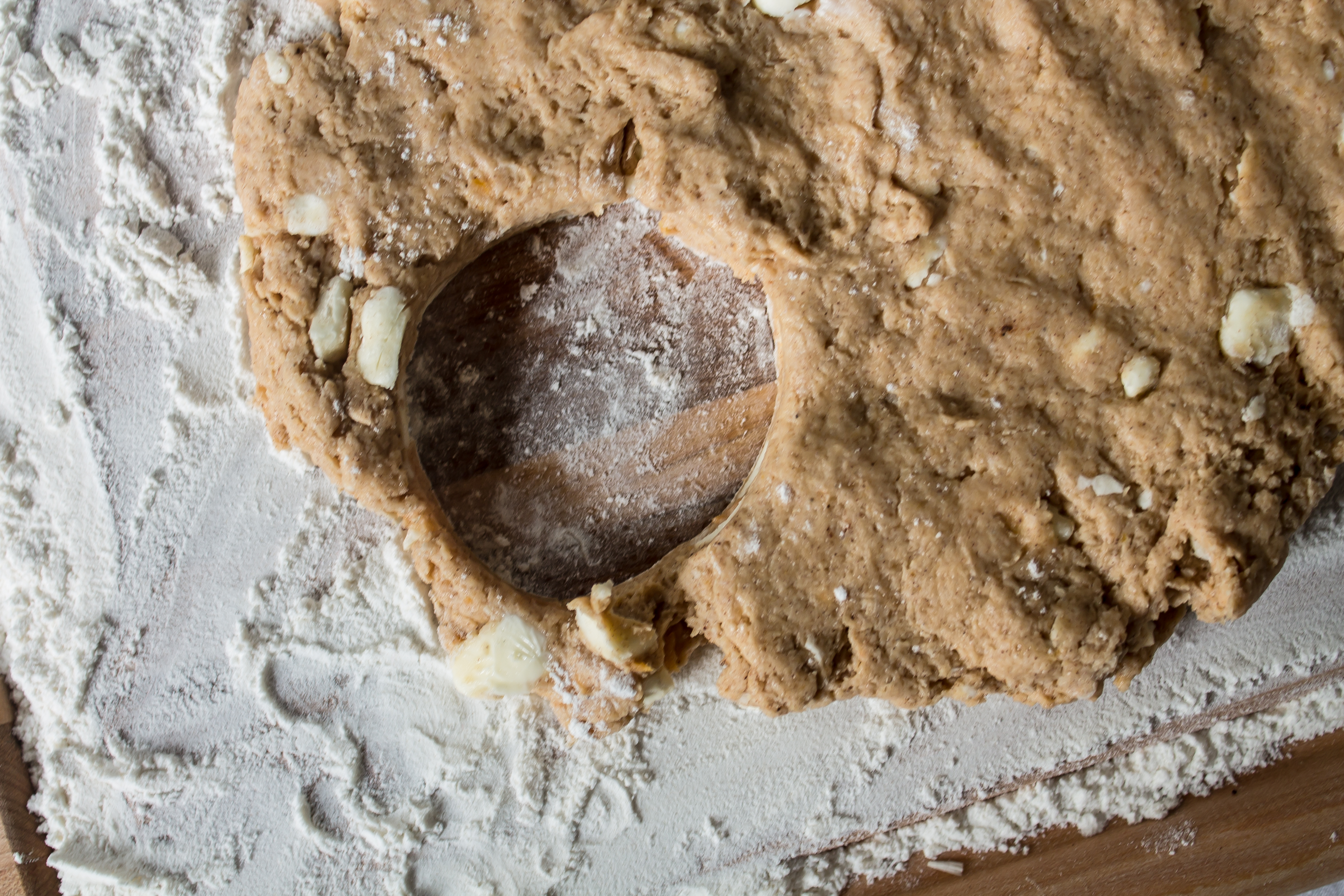 In a large bowl, whisk together flour, baking powder, sugar, brown sugar, cinnamon, nutmeg, ginger, cloves and salt. Add the well-chopped, cold butter and cut it into the flour mixture with a knife. Work it into the flour until the flour-butter mixture resembles a coarse meal. You want small bits of butter to be visible – those will make your biscuits flaky. If the butter has warmed up, chill the mixture for a few minutes until it is cold again.