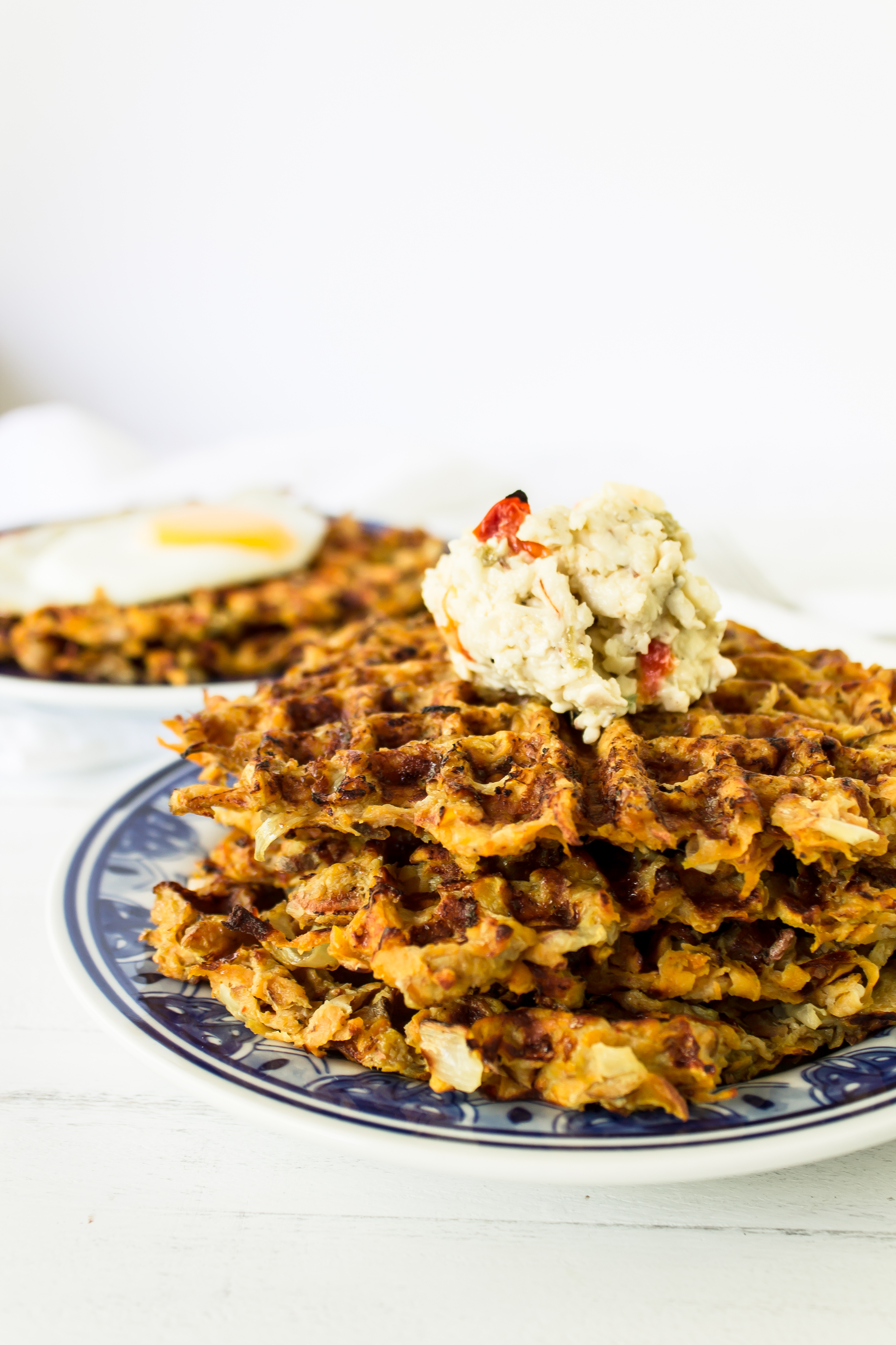 While the waffled sweet potato hash browns are delicious on their own, or when topped with a runny sunny-side up egg, the smoked gouda pimento cheese is really what steals the spotlight. We made a huge recipe and topped our biscuits, put it in our eggs, dipped veggies and crackers in it, and ate it with these waffled hash browns. It was absurdly delicious every time. Make a tub of it – you won’t regret it. Soooooo good. Also, aside from all of the grating (which can be sped along if you are lucky enough to have a grater attachment on your food processor), these recipes are both so so easy. If you can grate and mix, you can make waffled sweet potato hash browns and smoked Gouda pimento cheese. It really seems too simple, but sometimes those are the best kinds of recipes.