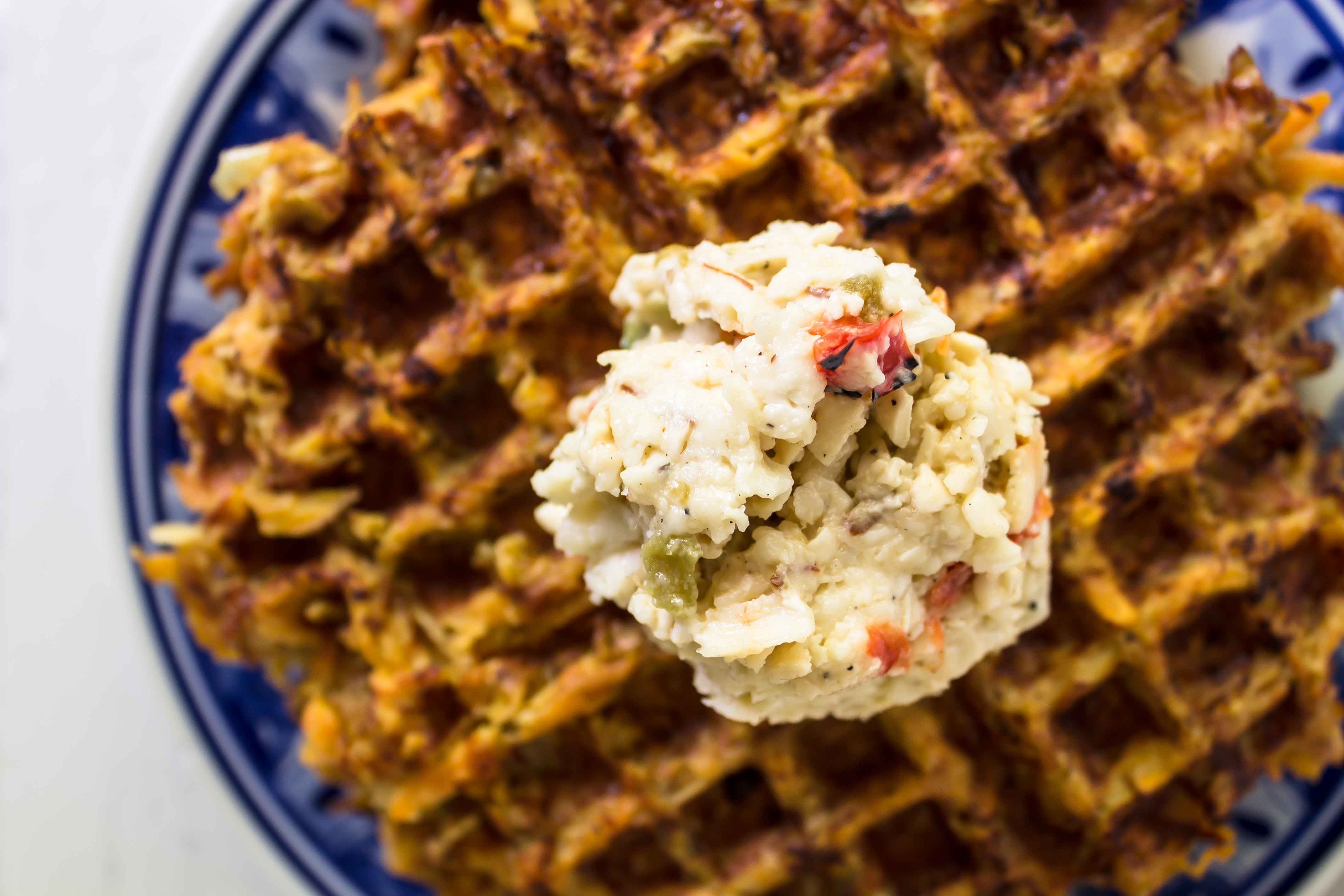 Preheat waffle iron to medium-high and grease both sides of the iron well. Place a scoop of the sweet potato mixture in the center of the waffle iron and close the lid. Peak at the color a few times while the hash brown cooks and remove after about 5 minutes, depending on your waffle iron. Serve with eggs and smoked gouda pimento cheese. Makes about 5-6 small waffled hash browns. If you want to try to make these crispier, reduce the number of eggs.