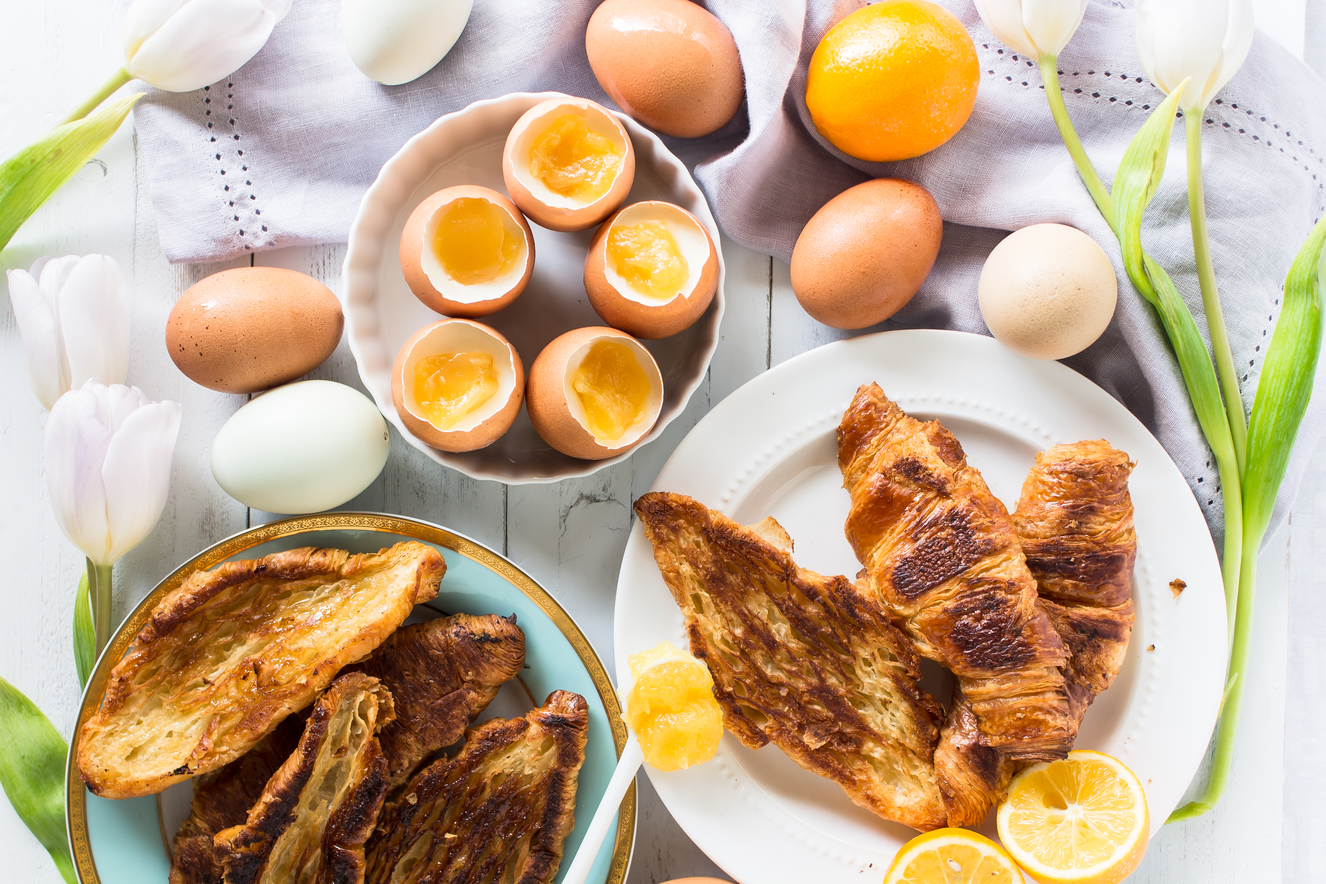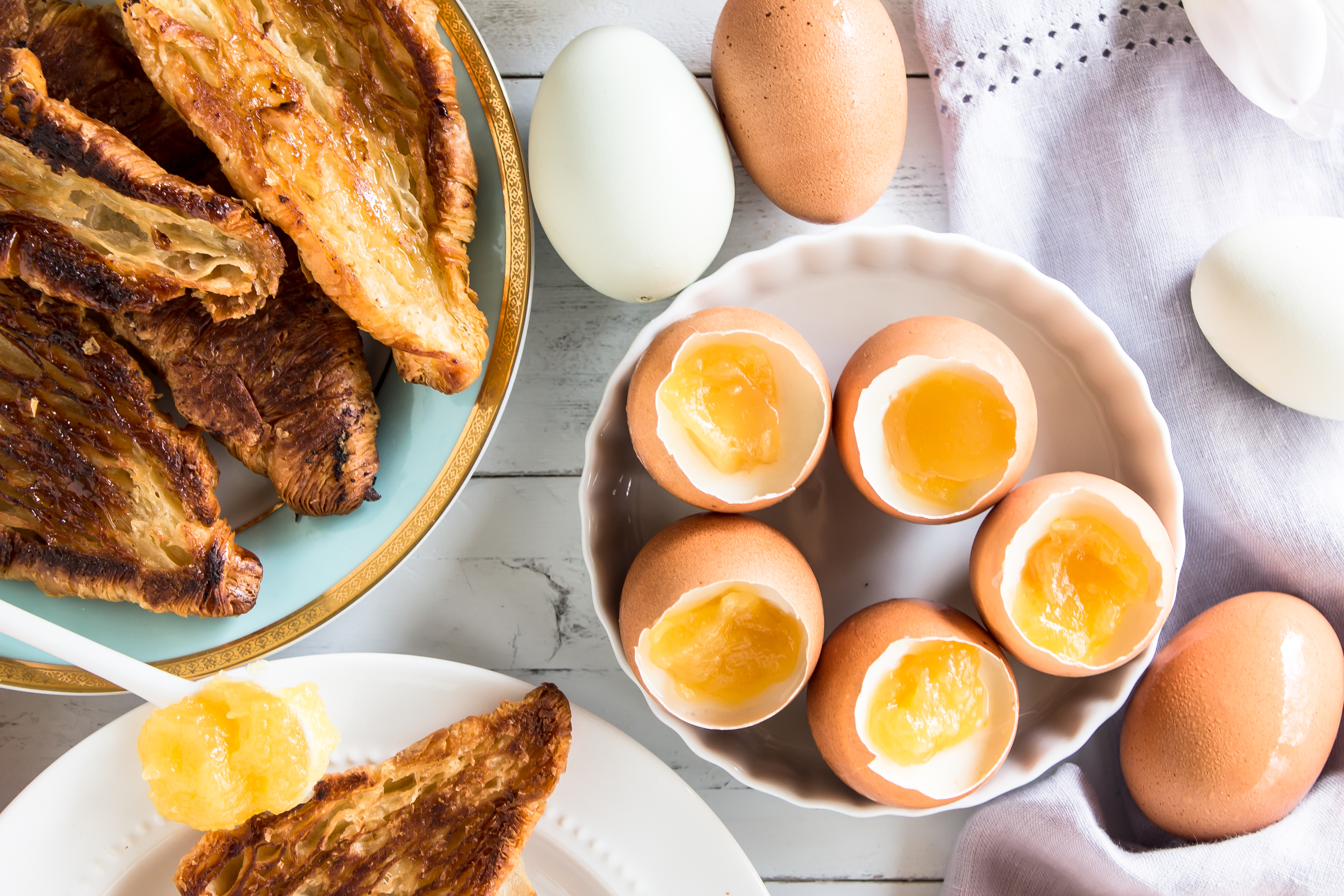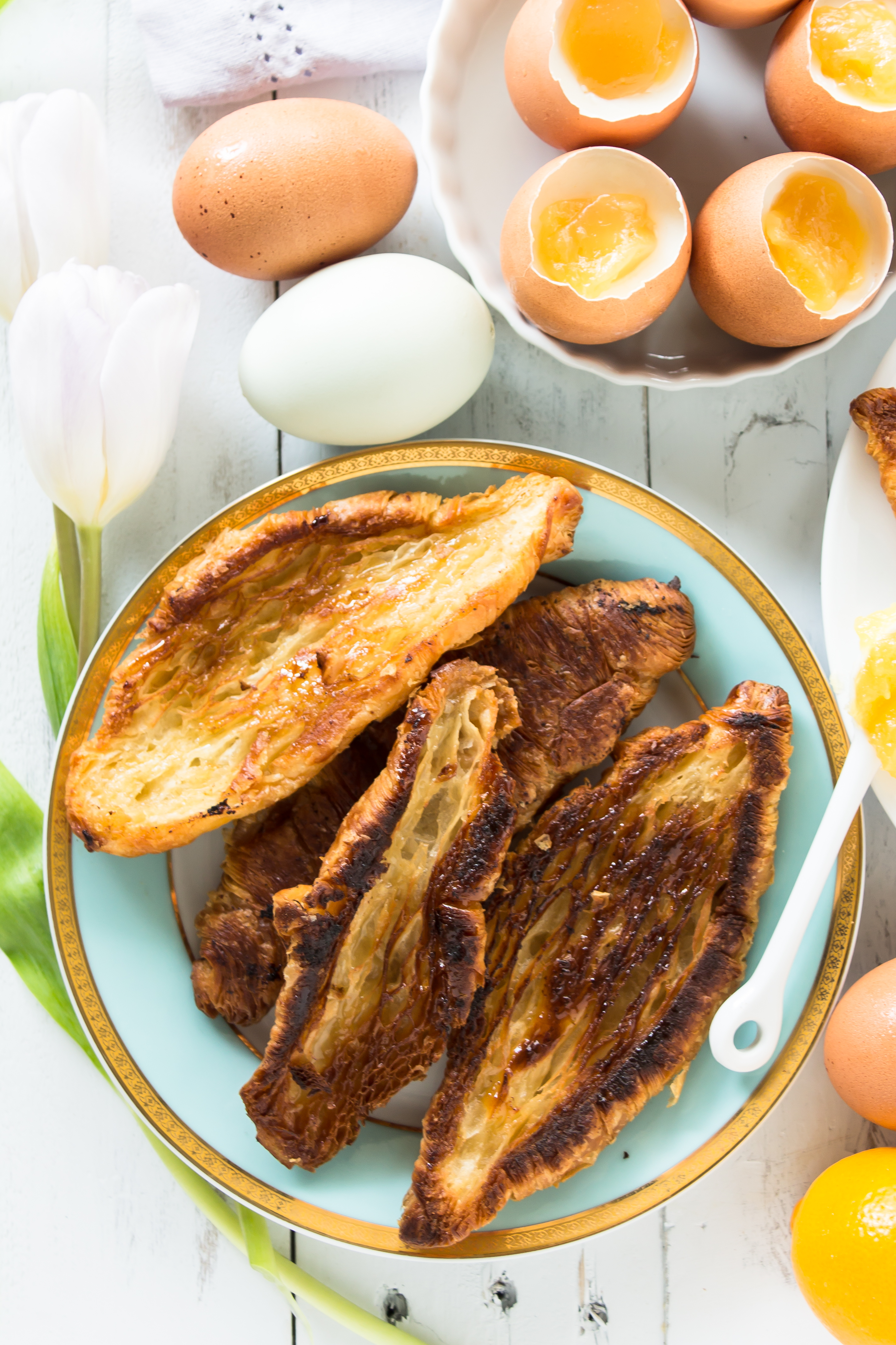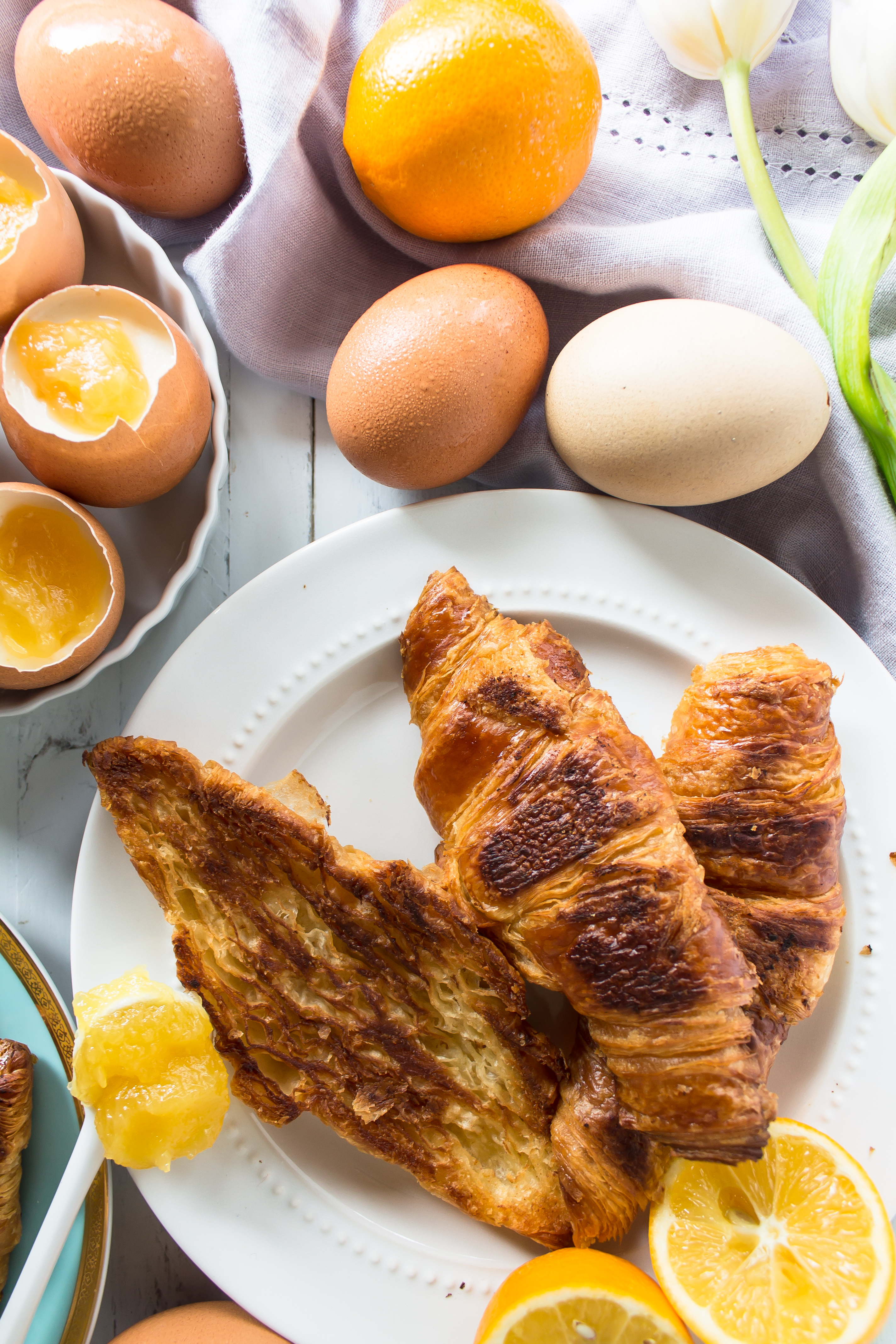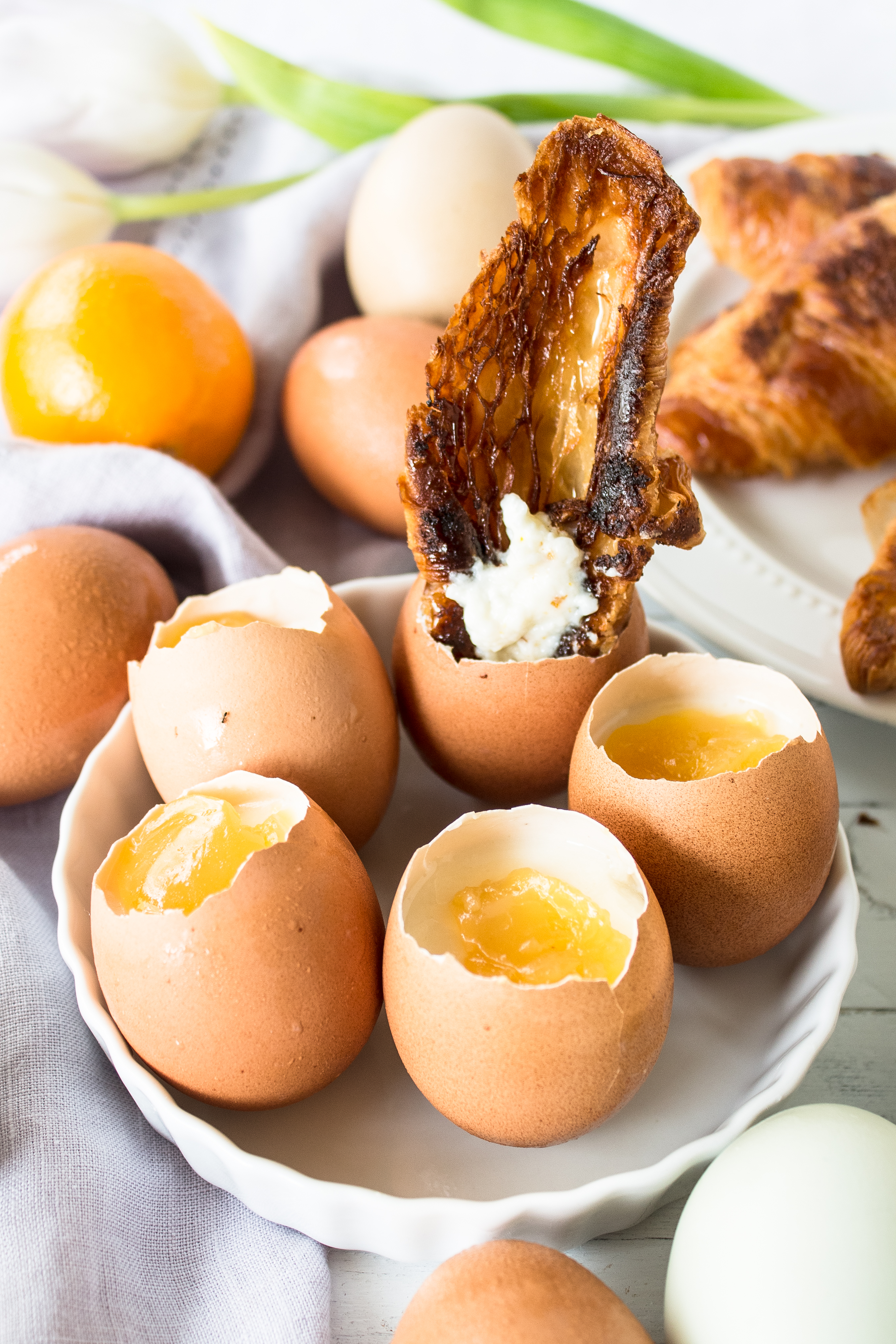I’m sorry for the unintentional hiatus over here – I had concepts and ideas for last week’s posts and life was so crazy and busy that I didn’t have a blink of free time to get anything done in this space. I hope you will forgive me if I give you a caramelized croissant and a delicious, healthy, easy spring brunch. These pictures make me so happy. They are bright and cheery…and deceiving. The little eggs you see, tricky, tricky, those are. They may look like soft boiled eggs, but the shells actually contain yogurt panna cotta with a lemon curd “yolk.”