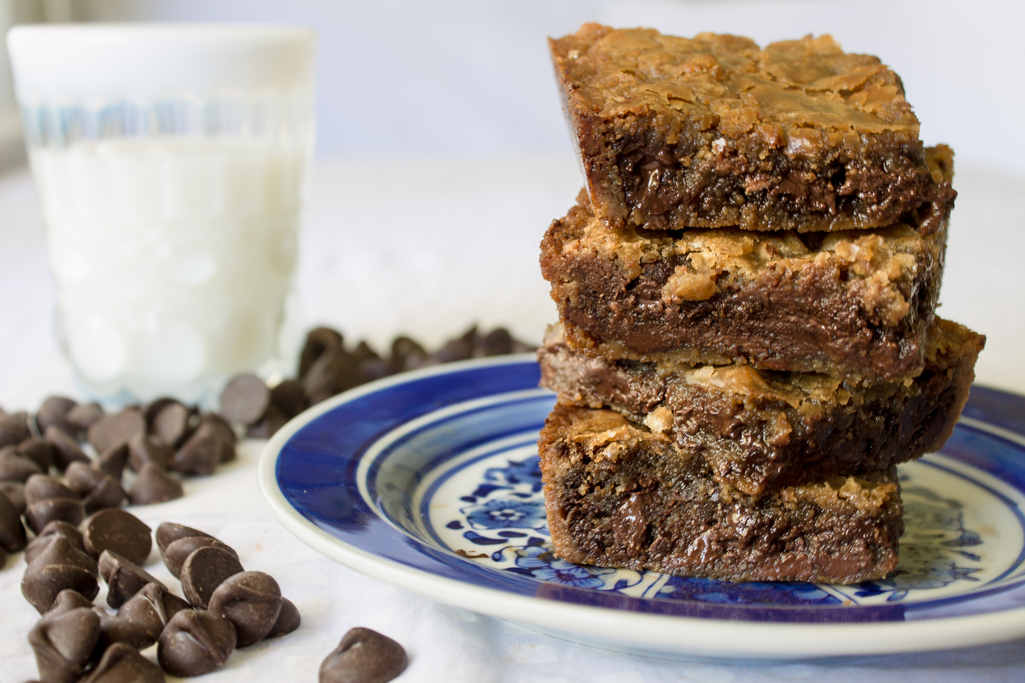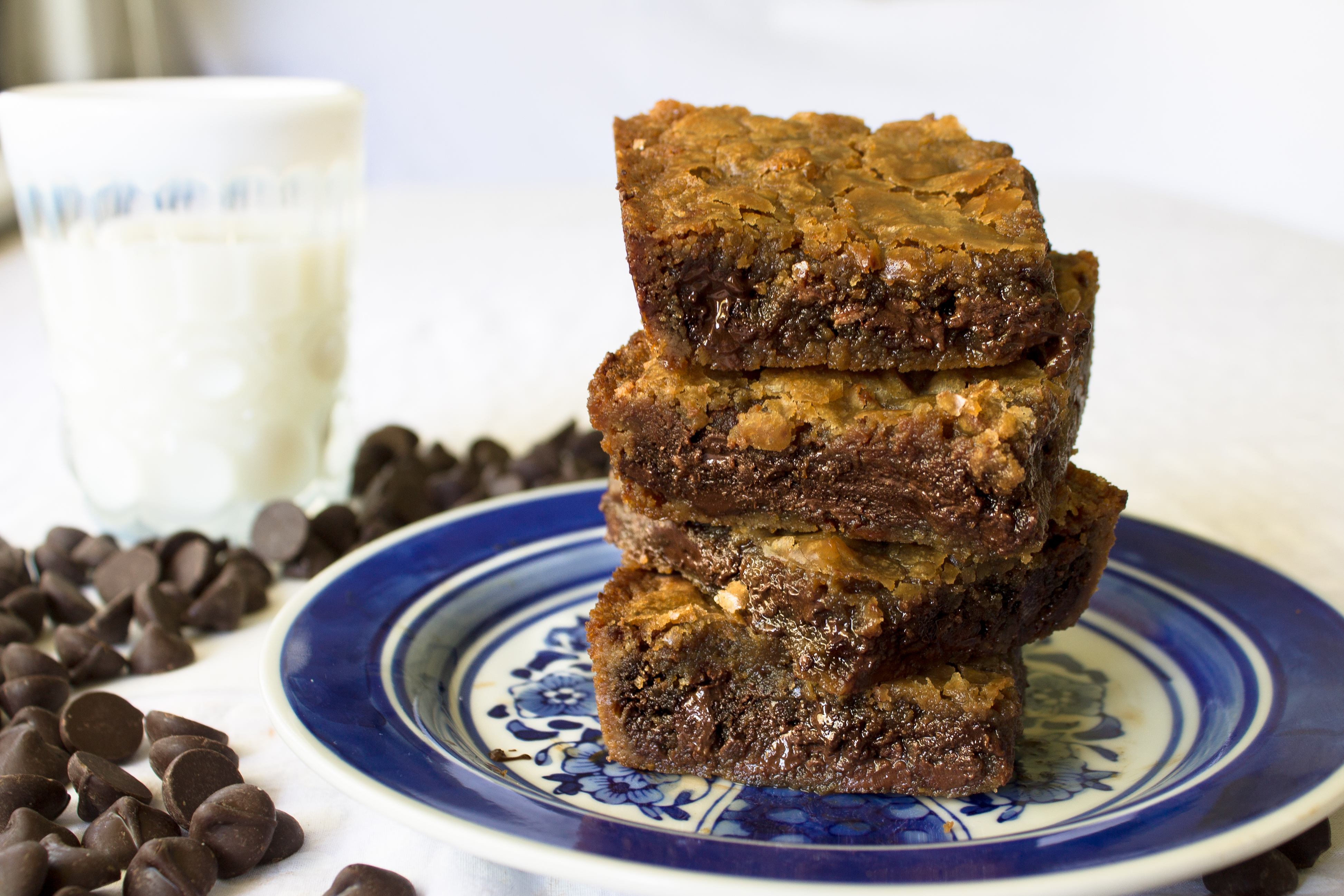 I was a bit disappointed the first time I tried a blondie.  With all of the comparison I had heard, I was expecting a vanilla brownie.  Wrong.  Blondies have a taste all their own, one that is sweet and caramelly.  In this recipe, I set out to create a blondie so full of chocolate that good old brownie would be proud to claim her as a sister.  I mean, I’m a bit biased, but who wouldn’t want a blondie as their sister ;)