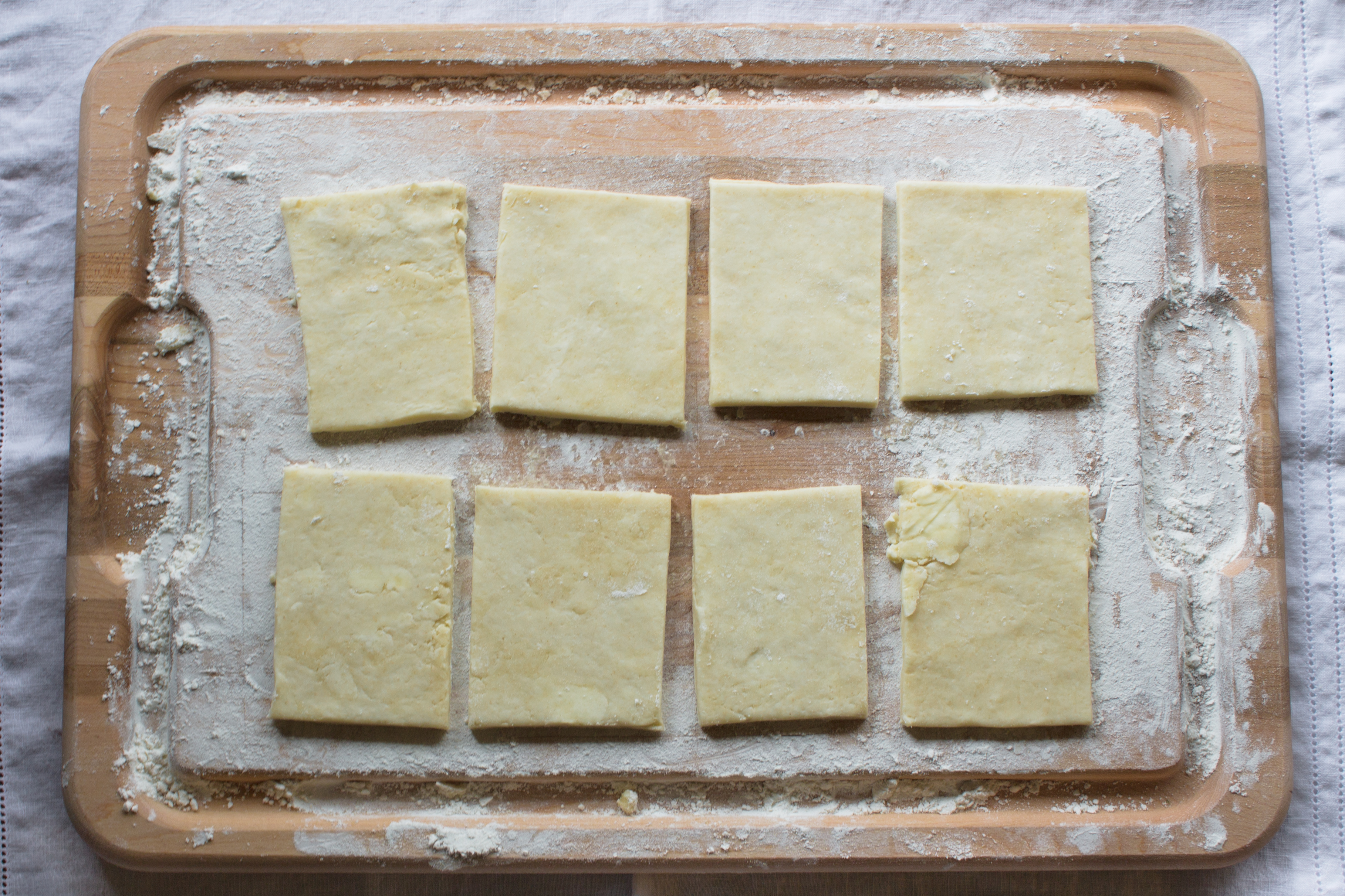 Remove one chilled disc of dough from the refrigerator and roll into a rectangle about 1/8 inch thick. Trim the edges and cut the dough into 8-12 rectangles, depending on the size of your rolled-out dough. Place your rectangles onto a baking sheet lined with parchment paper. The dough won’t spread much, so don’t worry about placing the dough close together. Place the baking sheet in the refrigerator. Take the second disc out of the refrigerator and repeat the process. The rectangles from this second disc will be the tops of your pop tarts. Place your second set of rectangles on another baking sheet and into the refrigerator as you remove your first set to prepare them for baking.